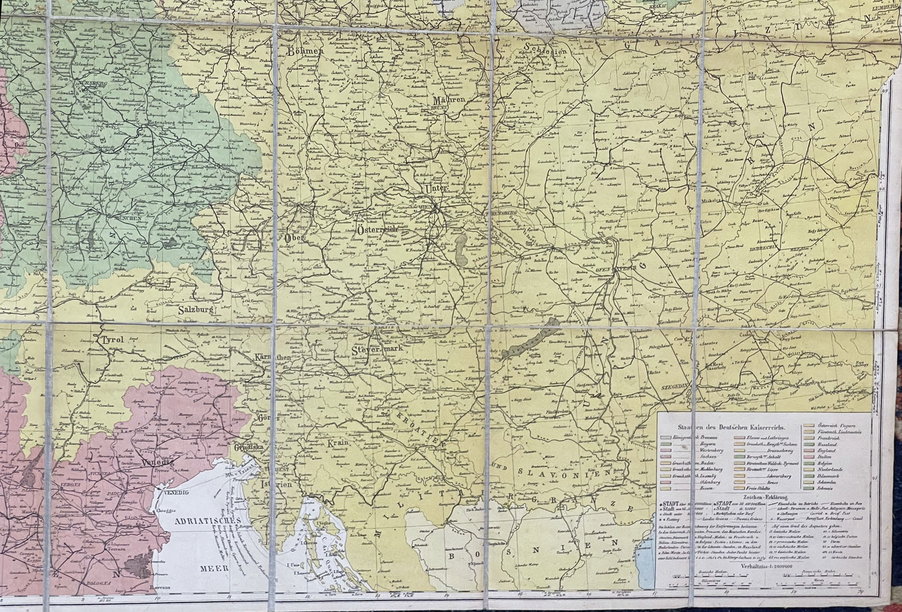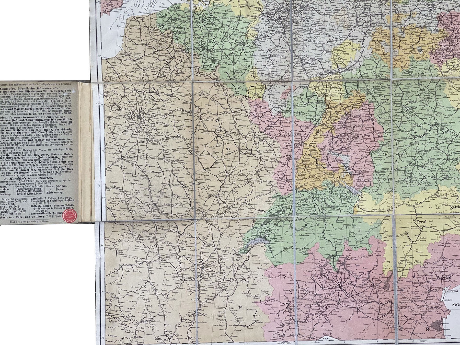 Colored German Post and railway travel map of Central Europe, in 28 folding parts