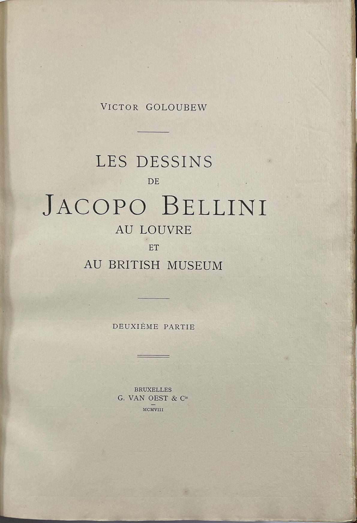 Goloubew, Victor. Les dessins de Jacopo Bellini au Louvre et au British Museum. I. Le livres d'esquisses de Londres. II. Le livres d'esquisses de Paris. Bruxelles : G. Van Oest & C.ie, 1908-1912.