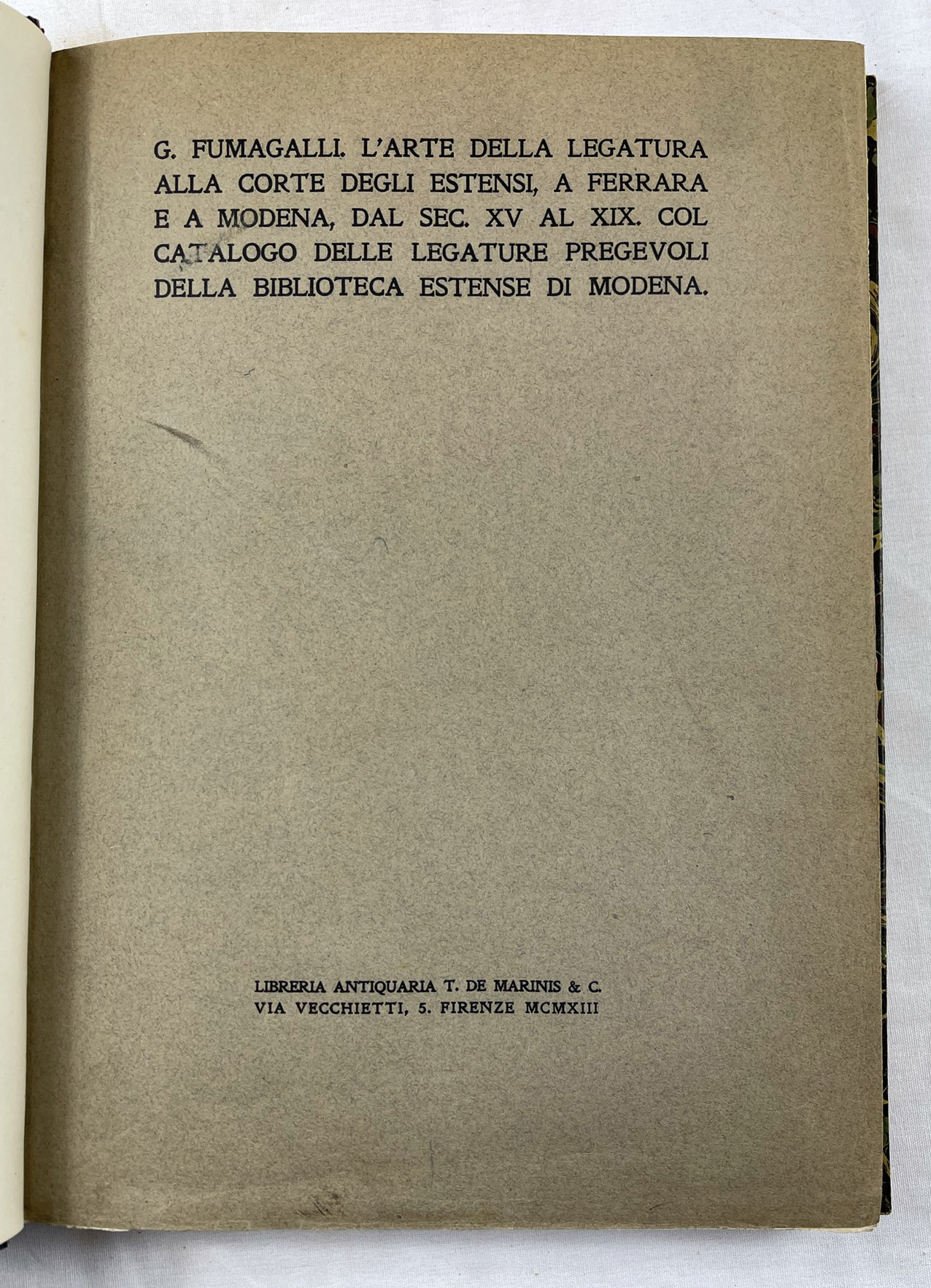 FUMAGALLI, Giuseppe. L'Arte della Legatura alla Corte degli Estensi, a Ferrara e a Modena, dal Sec. XV al XIX, col catalogo delle legature pregevoli della Biblioteca Estense di Modena . Florence: Stabilimento Tipografico Aldino for Libreria Antiquaria T. de Marinis, 1913.