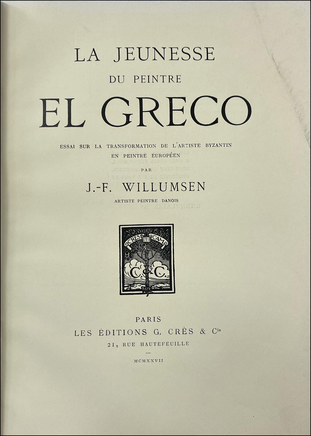 Willumsen, Jens Ferdinand. La jeunesse du peintre El Greco : essai sur la transforamtion de l'artiste byzantin en peintre europeen / par J.-F. Willumsen . Paris : Cres [1927].