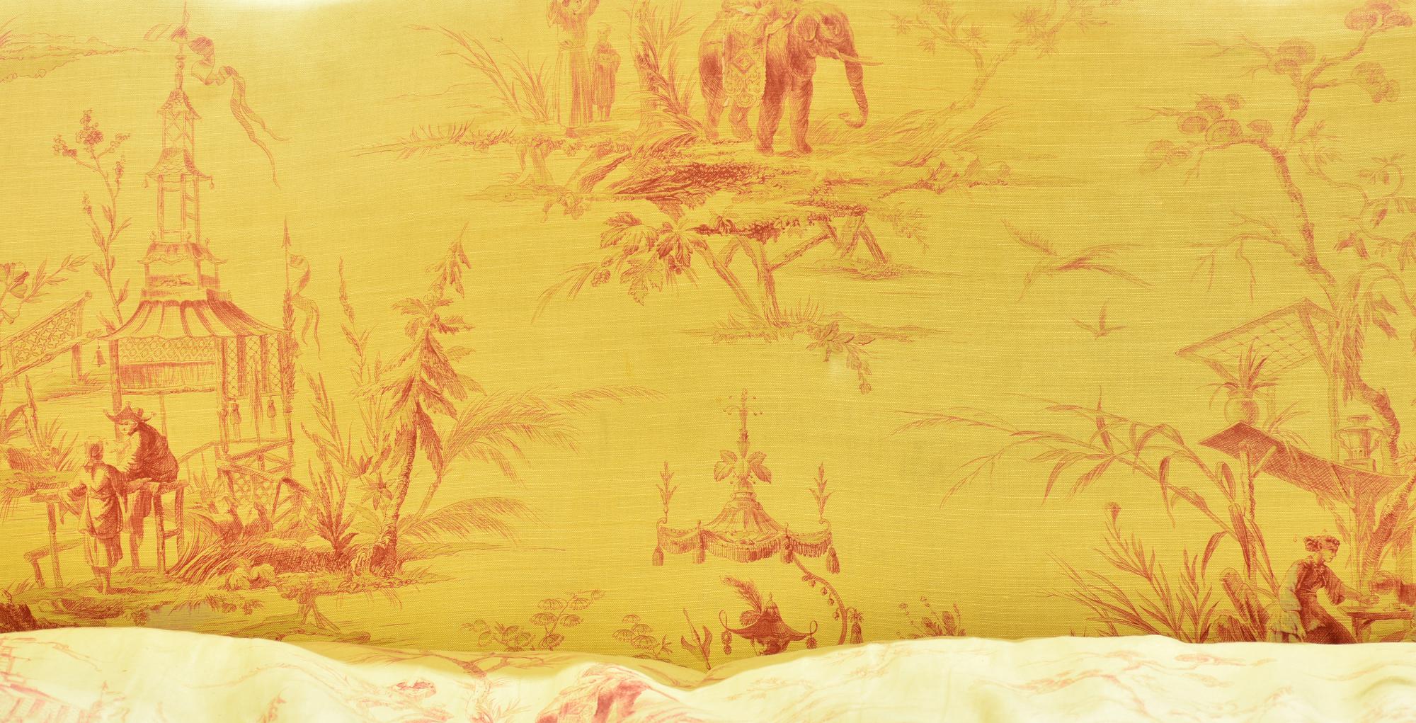 dormeuse in noce finemente scolpita, rivestimento a cineserie in toile de Jouy