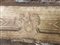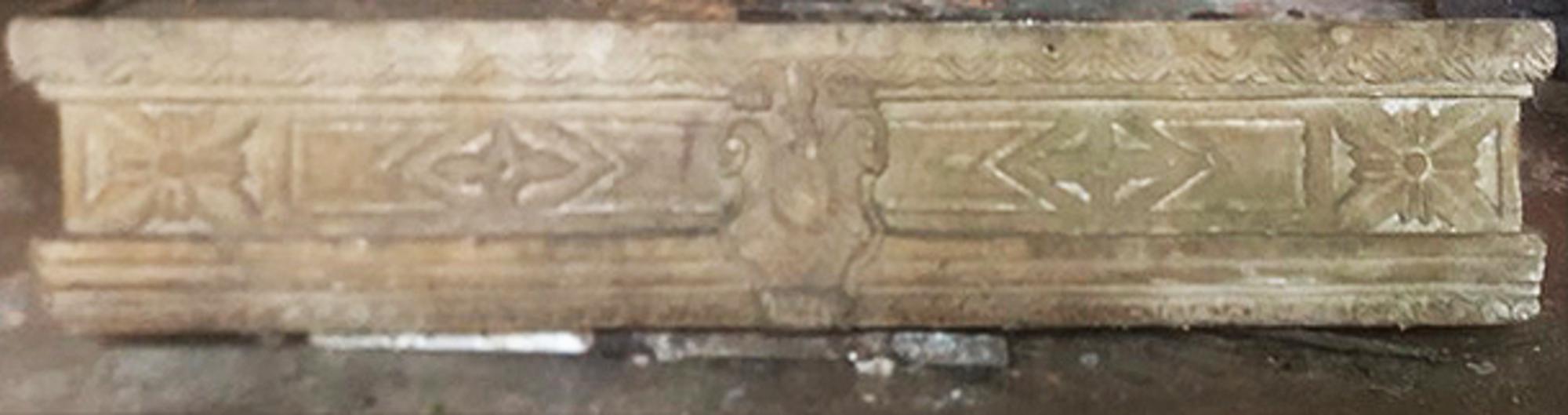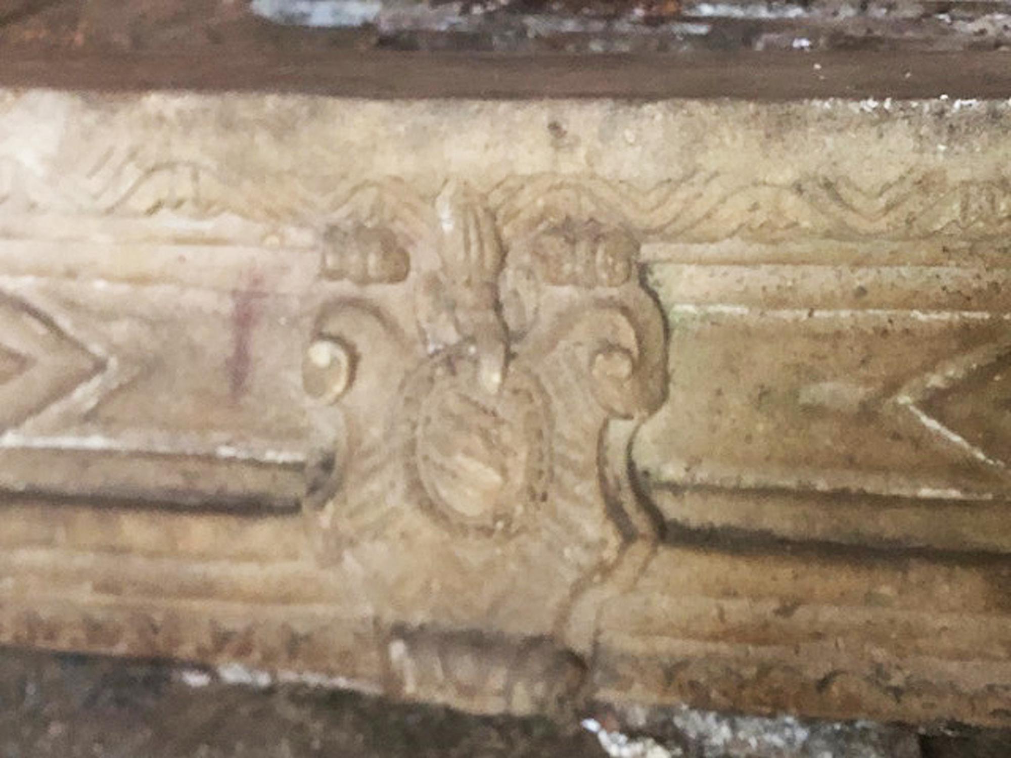 camino in pietra a tre elementi finemente scolpito con motivi geometrici e scudo centrale
