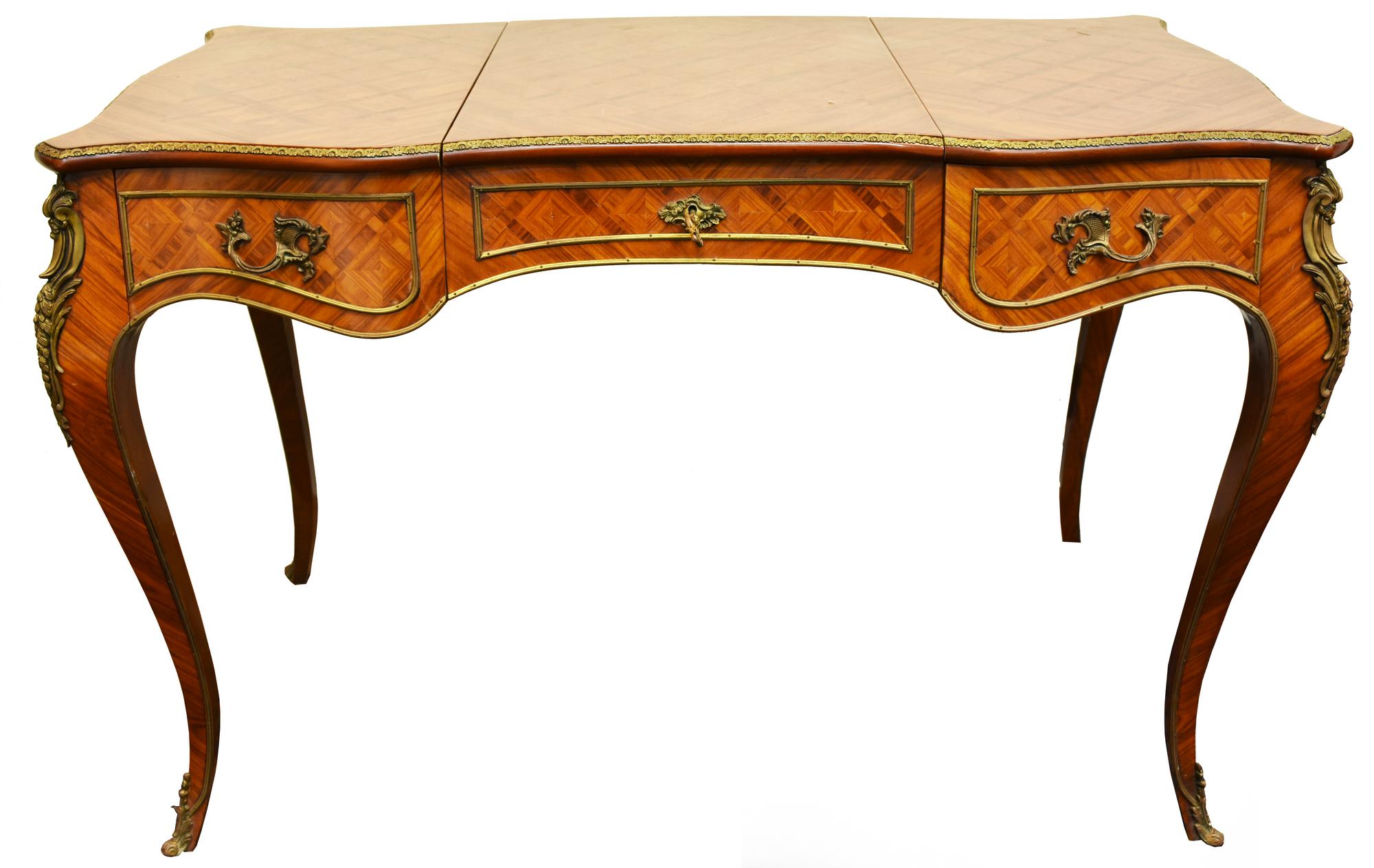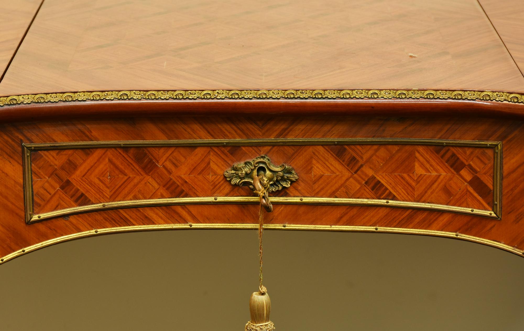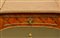 toilette in foggia diplomatica in legno lastrone con legni di varie essenze a motivi geometrici, finemente ornata con filettature in ottone dorato, piano apribile celante vano rivestito in damasco con specchio