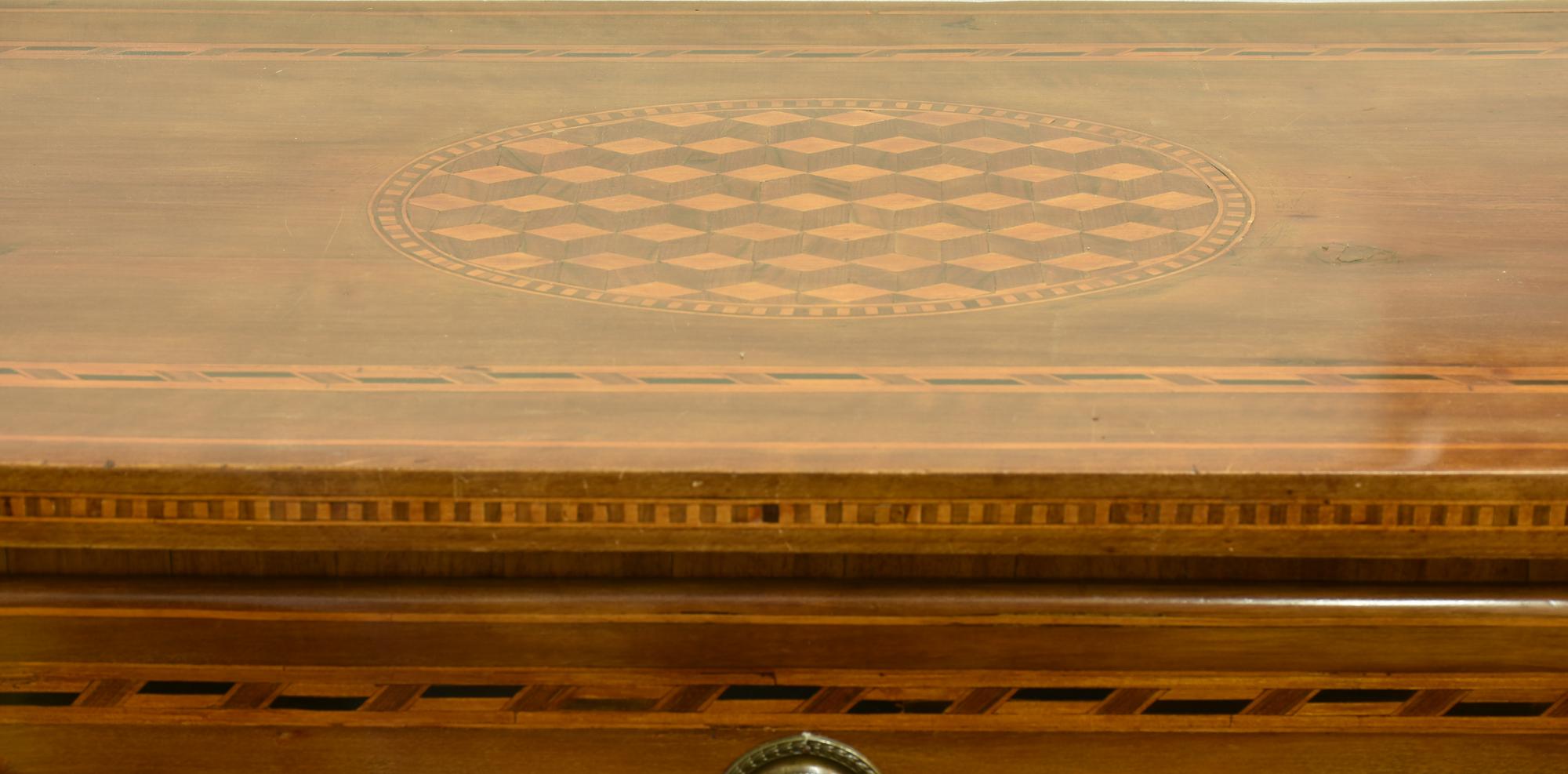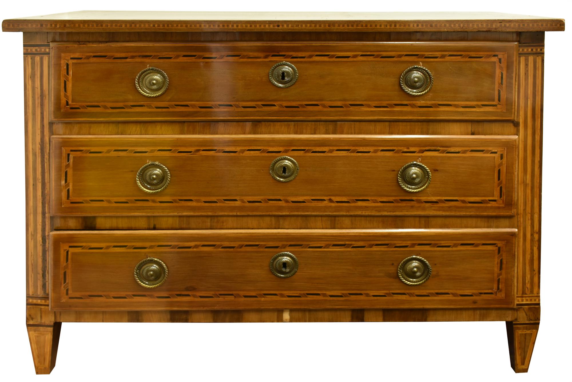 cassettone a tre cassetti finemente lastronato con filettature di legni di varie essenze, serratture originali, ferramenta in stile posteriore