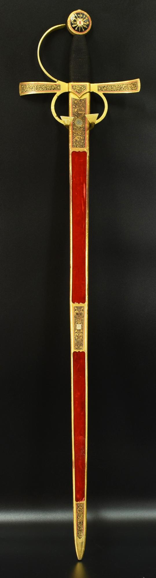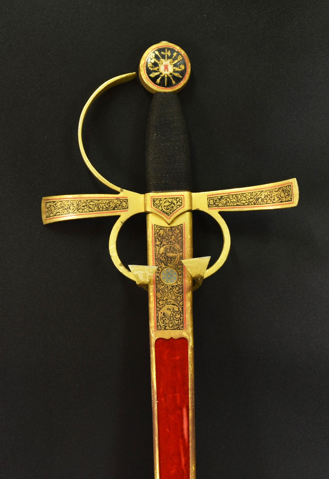 spada decorata con custodia in velluto e metallo dorato recante simboli araldici spagnoli, impugnatura in corda