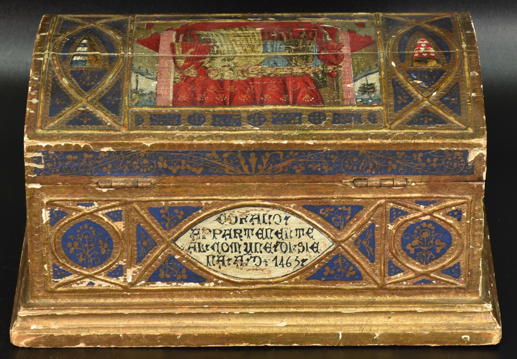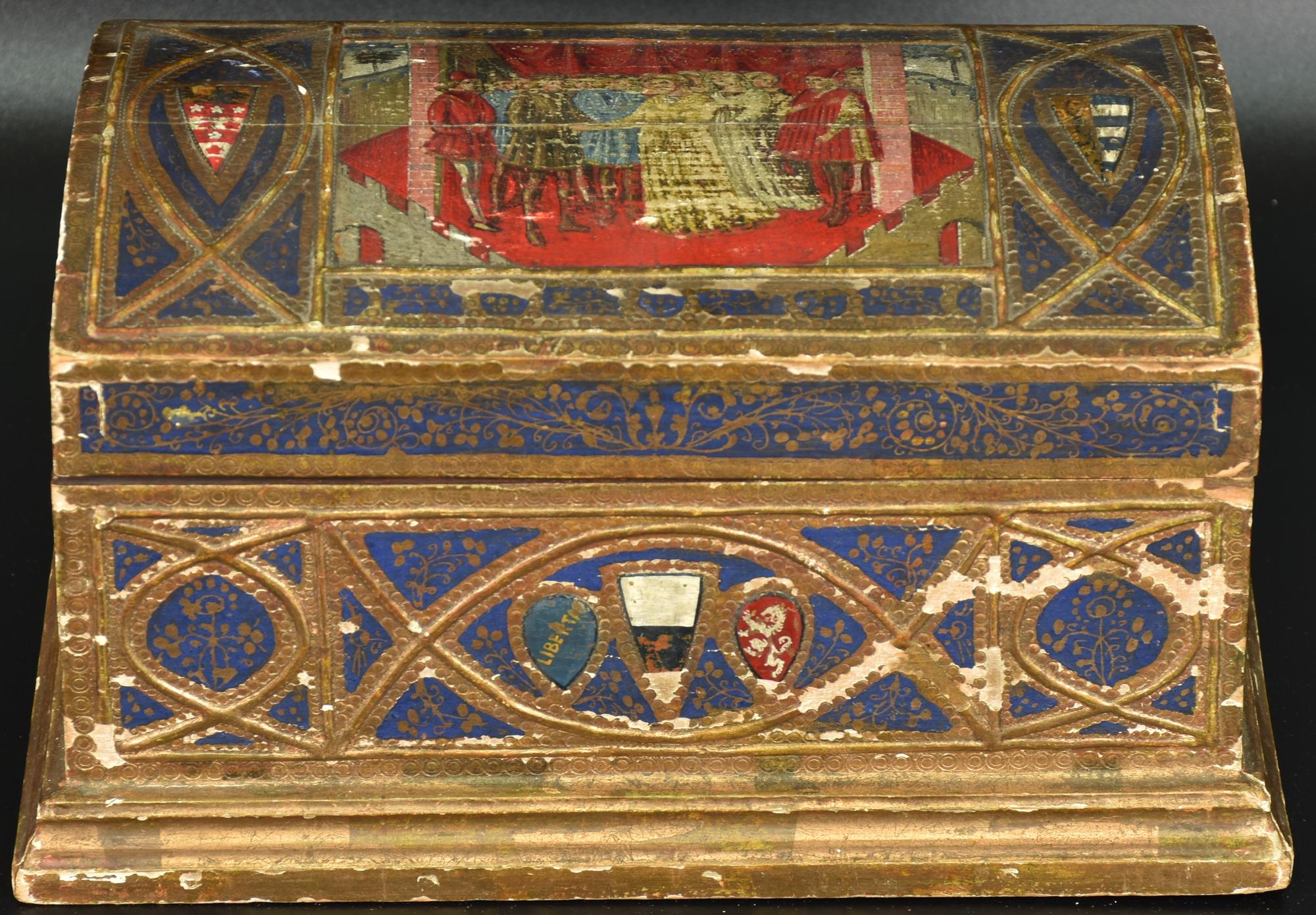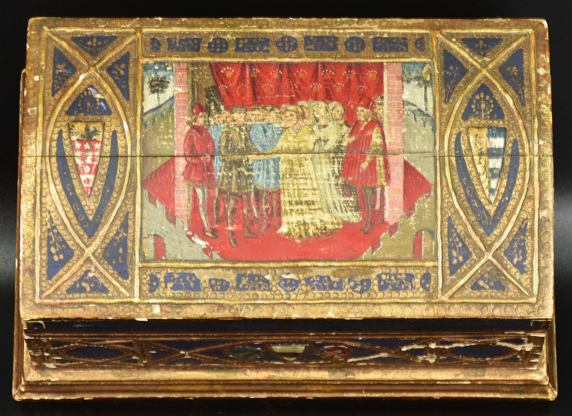 scatola in legno decorata in stile medievale recante stemmi nobiliari