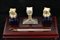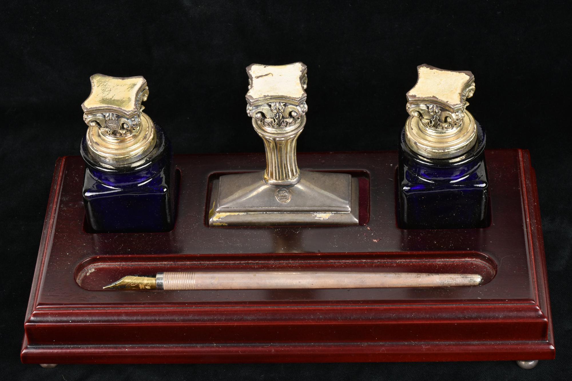 in legno con boccette in vetro blu con tappi in metallo argentato a forma di capitelli romano compositi, sigillo e penna stilografica