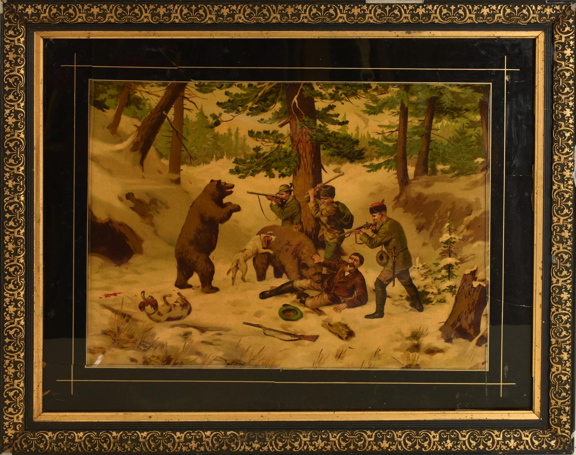 Anonimo CACCIA ALL'ORSO oleografia su carta, cm 40x50 Germia, inizio XX...