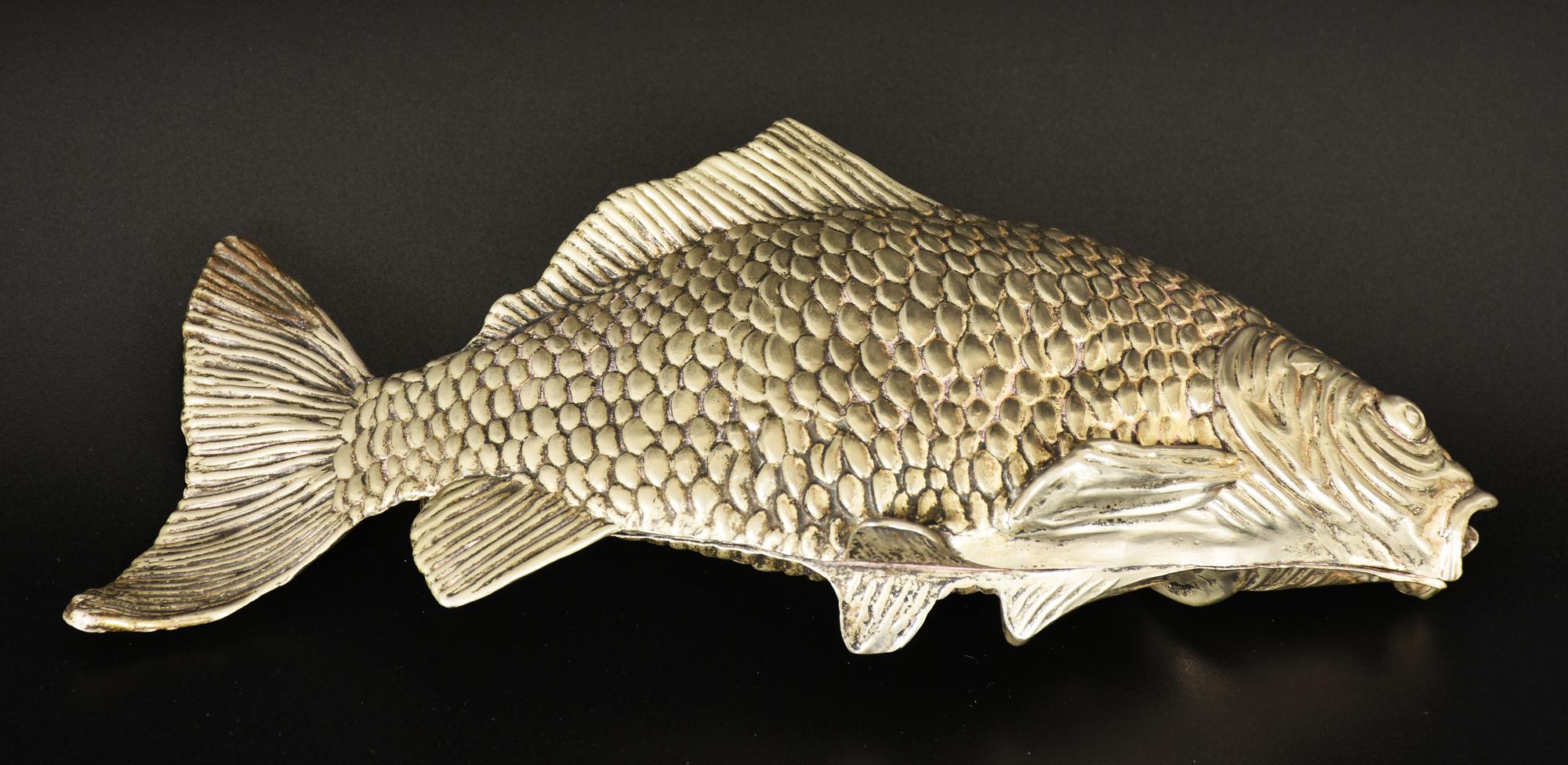 PORTA LETTERE IN METALLO ARGENTATO a forma di carpa, cm 23x11x4 Italia, anni '60