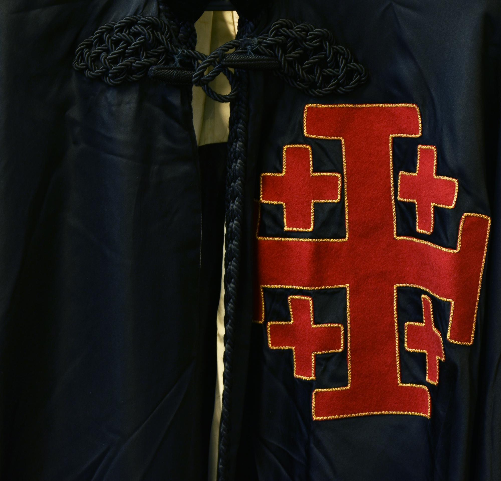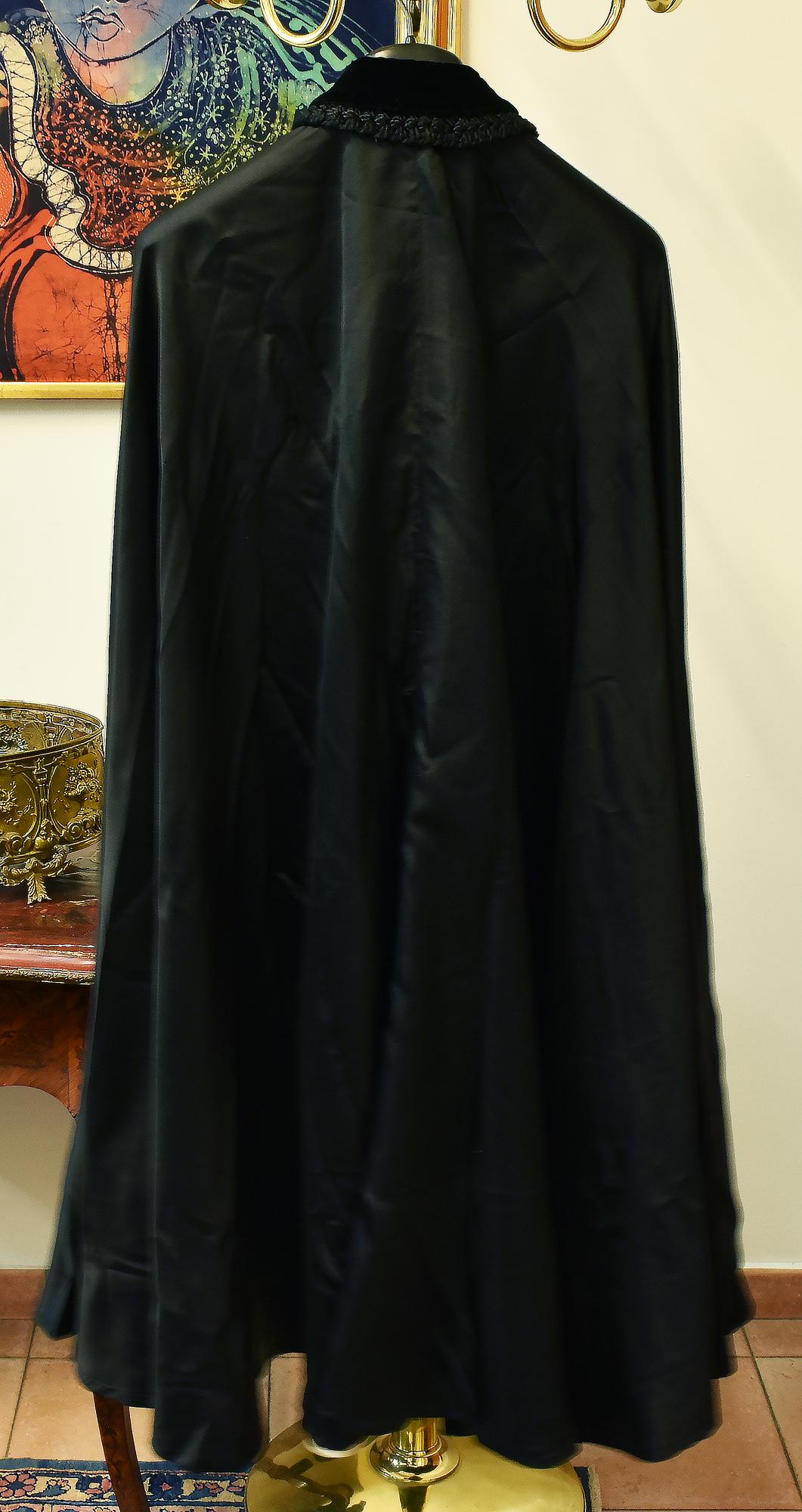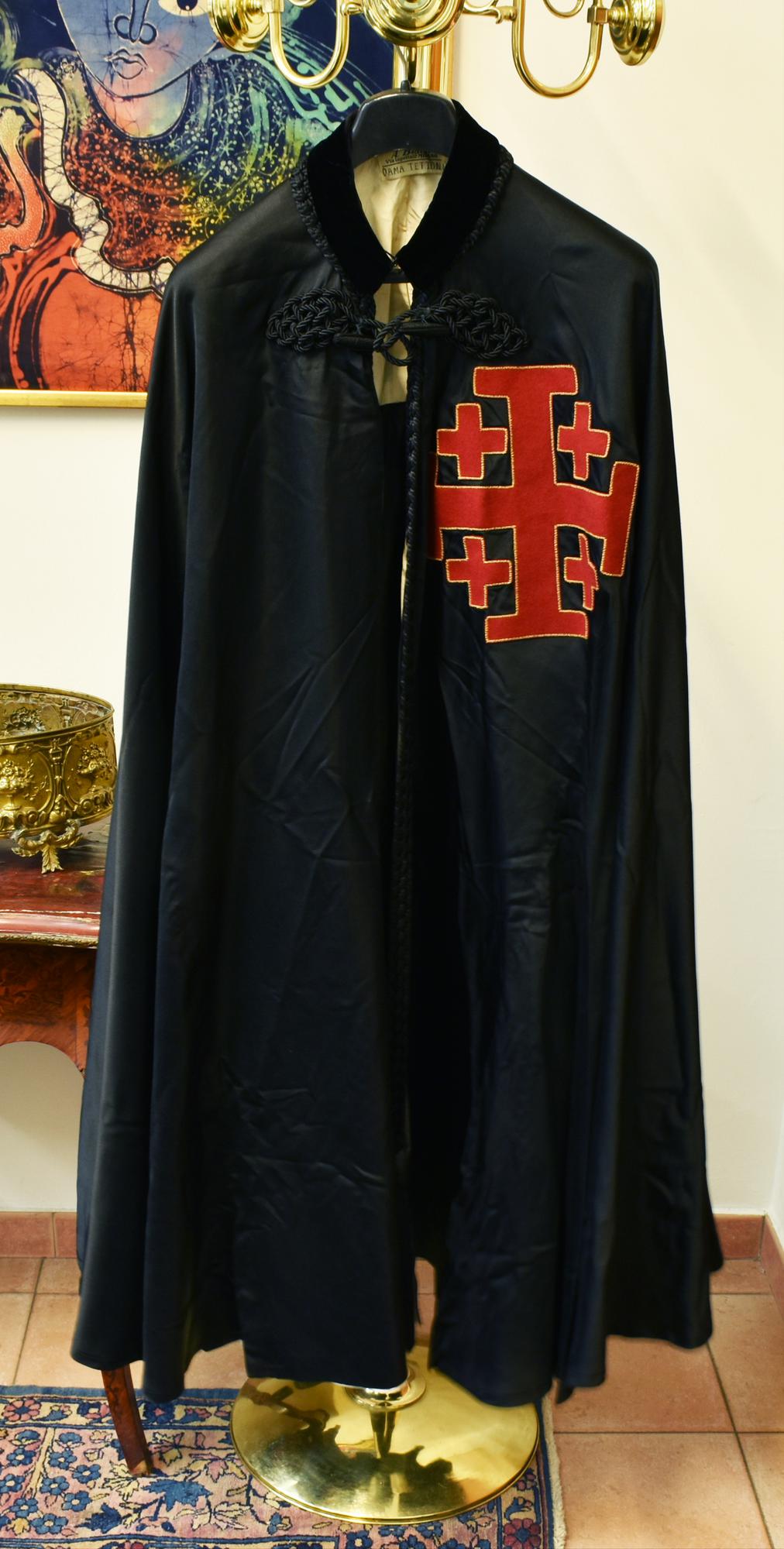 mantello da dama dell'ordine equestre del S. Sepolcro di Gerusalemme in raso con croce preziosa ricamata in vellutino, all'interno etichetta della Sartoria Bodini Milano