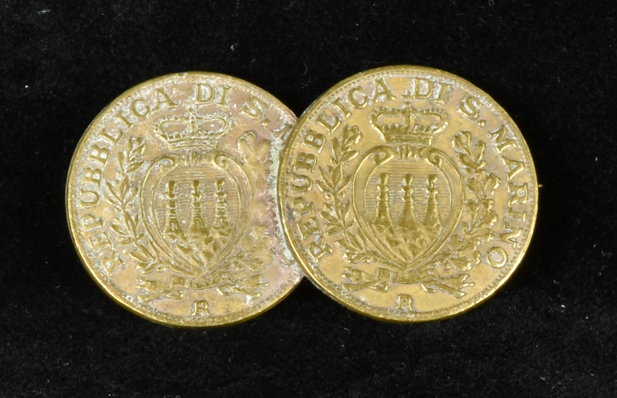 in ottone dorato raffigurante due monete da 5 centesimi della repubblica di San Marino