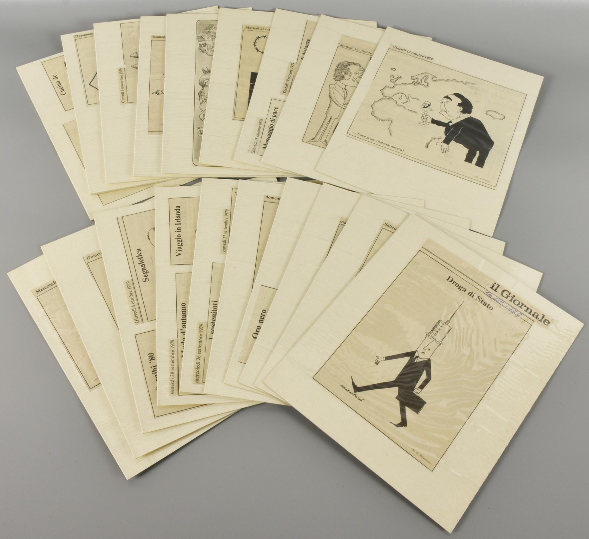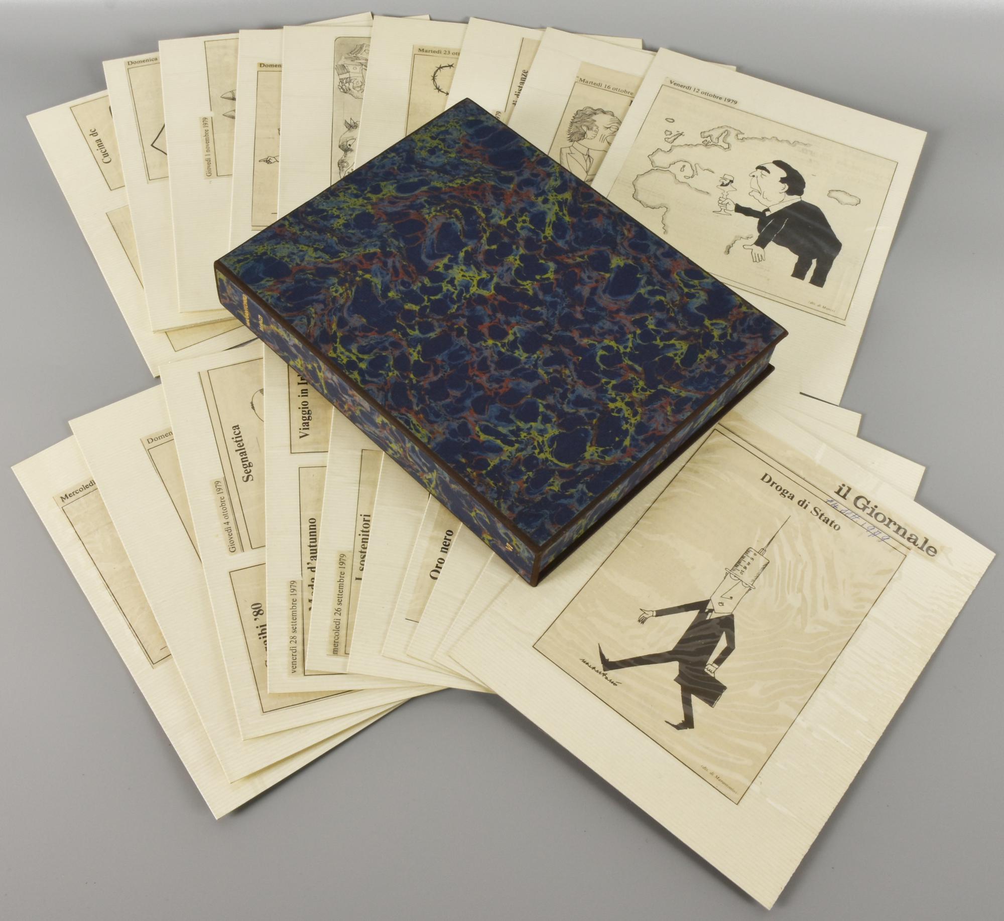 cofanetto di vignette satiriche ritagliate da "Il giornale" e incollate su 19 cartoncini, cofanetto cm 27x21,5x4, cartoncini cm 25x20