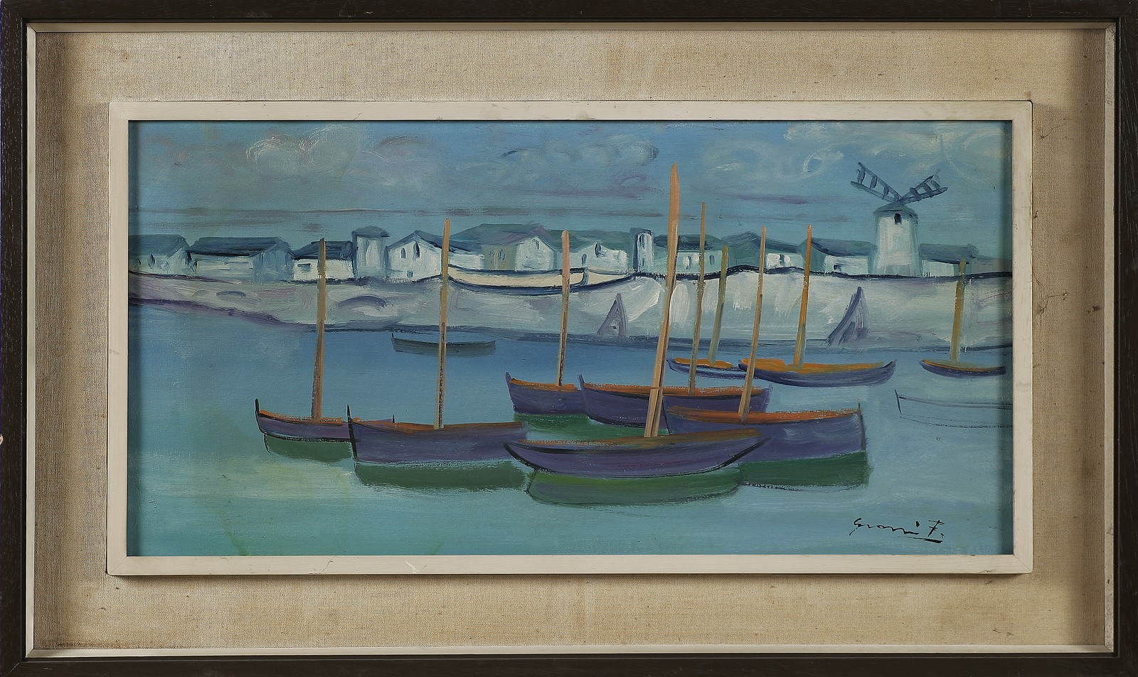 ANONIMO Barche. Olio su tela . Cm 61,50 x 32,50. Firma illeggibile in basso a destra. Cornice presente
