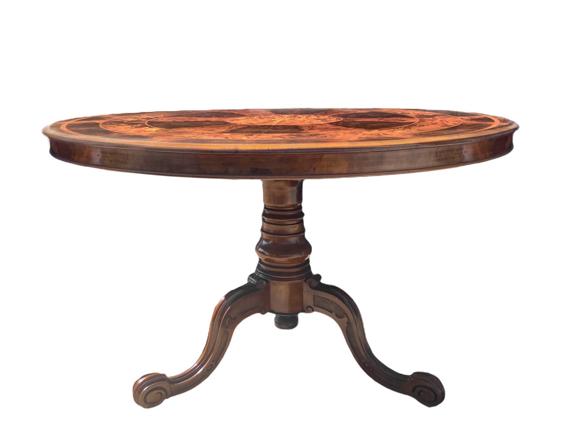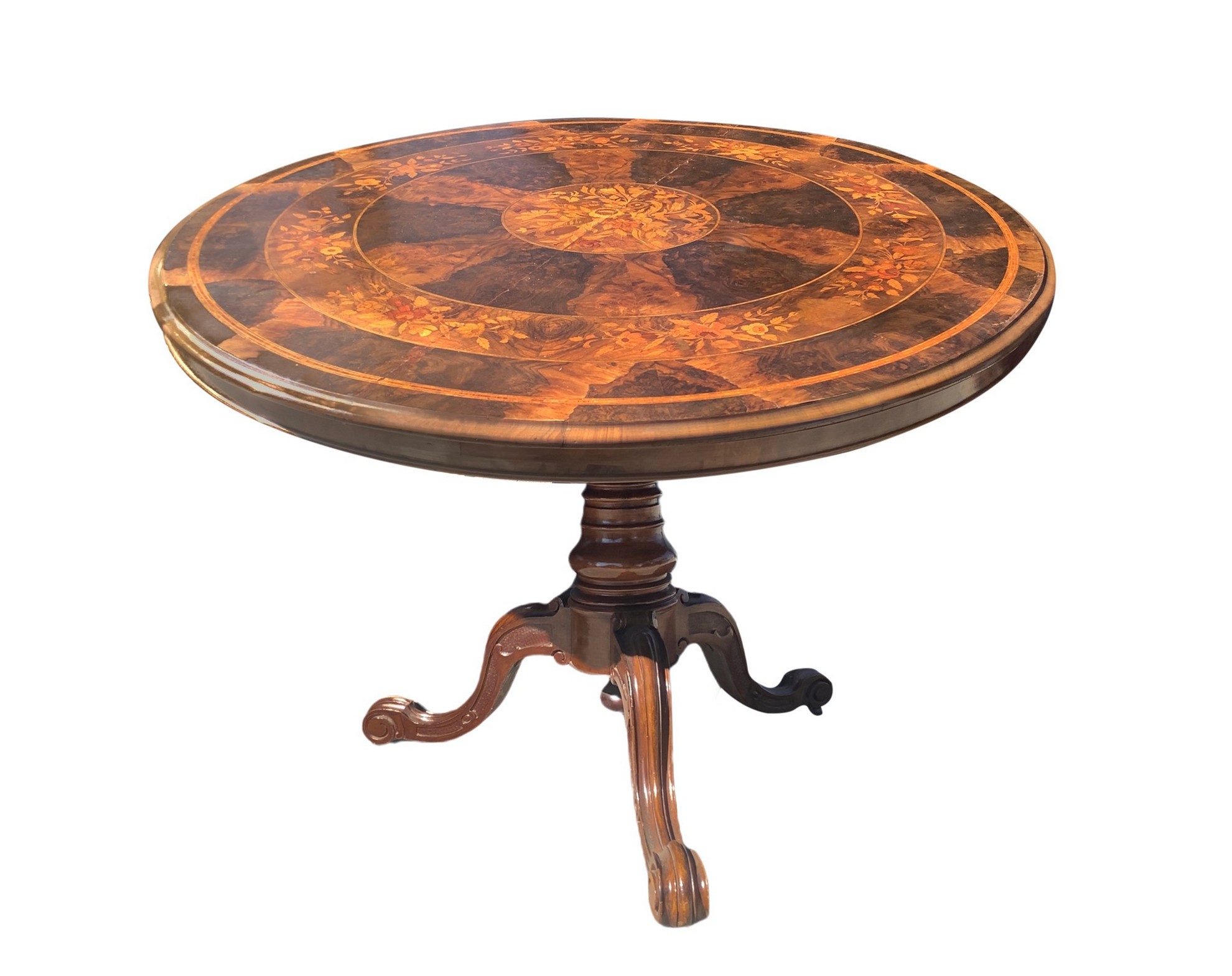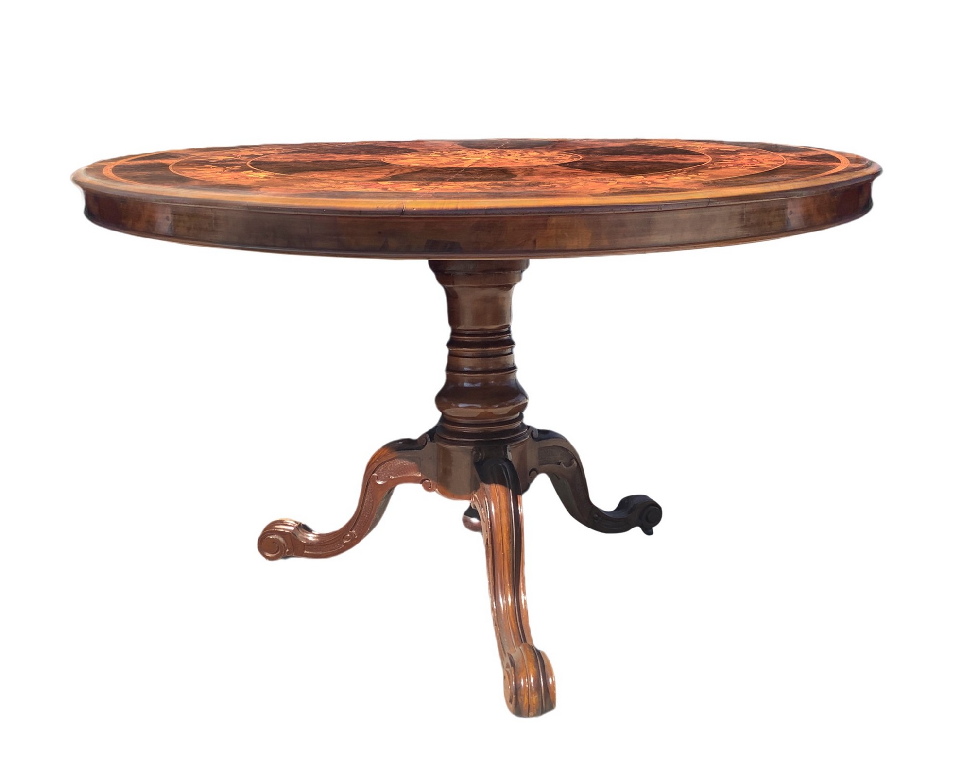 h 78 cm, d 130 cm Fine XIX secolo Tavolo circolare basculante con 5 sedie piano intarsiato a motivi floreali, piedi a quattro razze