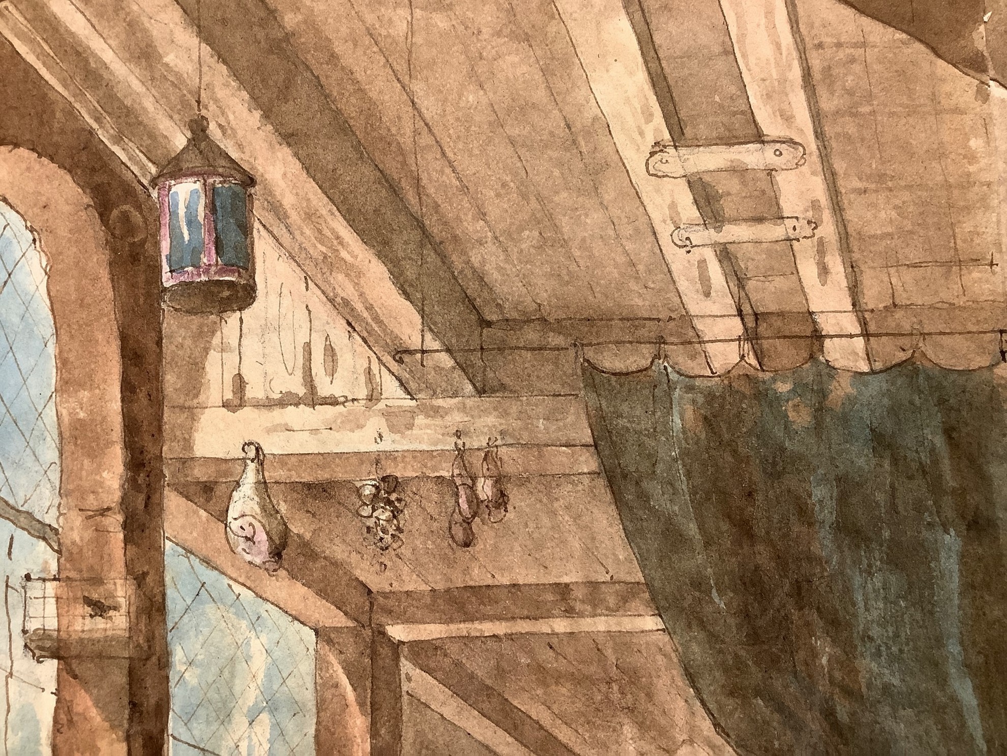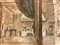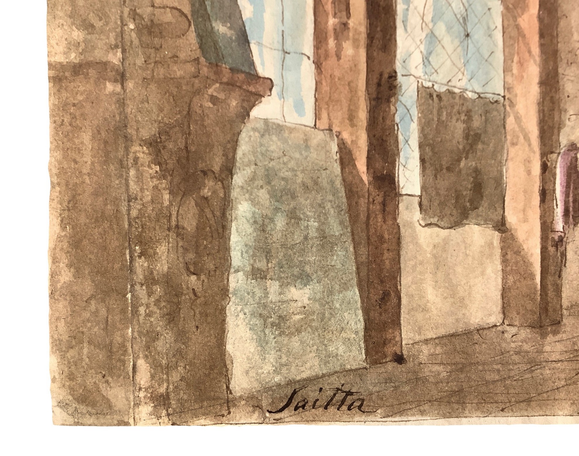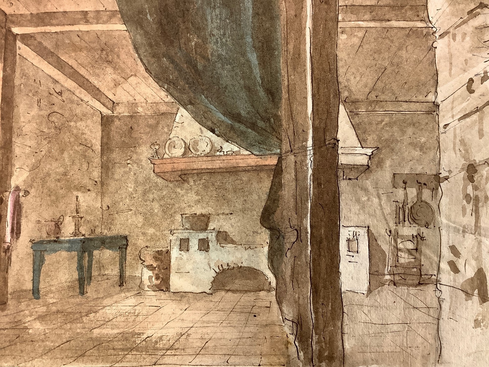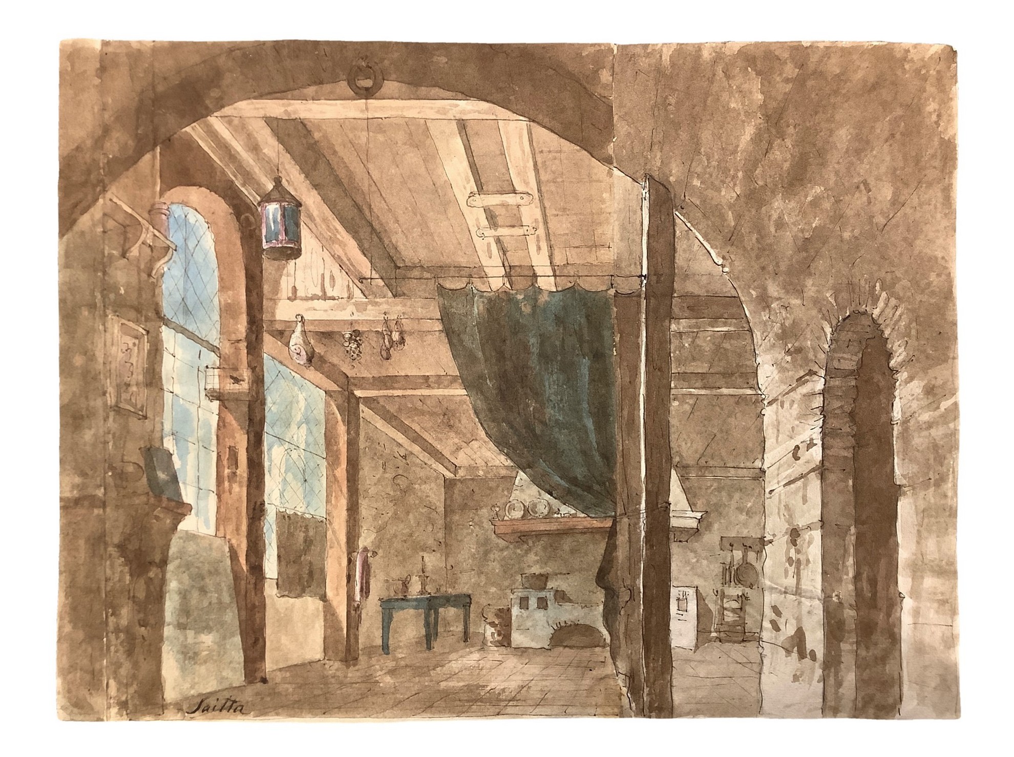 Fine XIX secolo Interno con cucina Disegno acquarellato tecnica mista Firmato in basso a sinistra Saitta