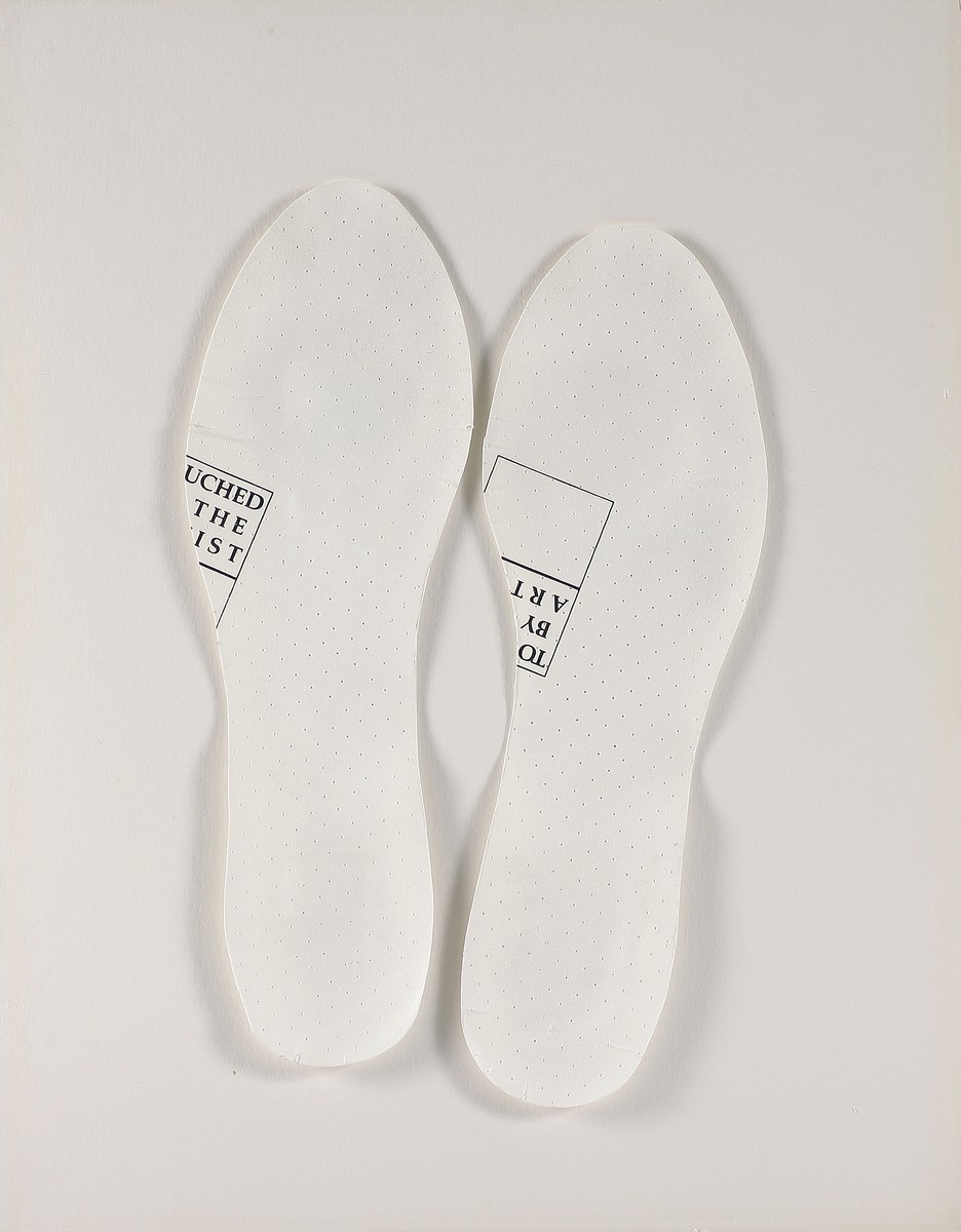 ANTONI JANINE (n. 1964) Touched by the artist. Oggetto. Cm 24,00. In teca di plexiglass: 34,5x27x1cm. Opera costituita da un paio di pantofole su cui è impressa l'impronta stessa dell'artista.