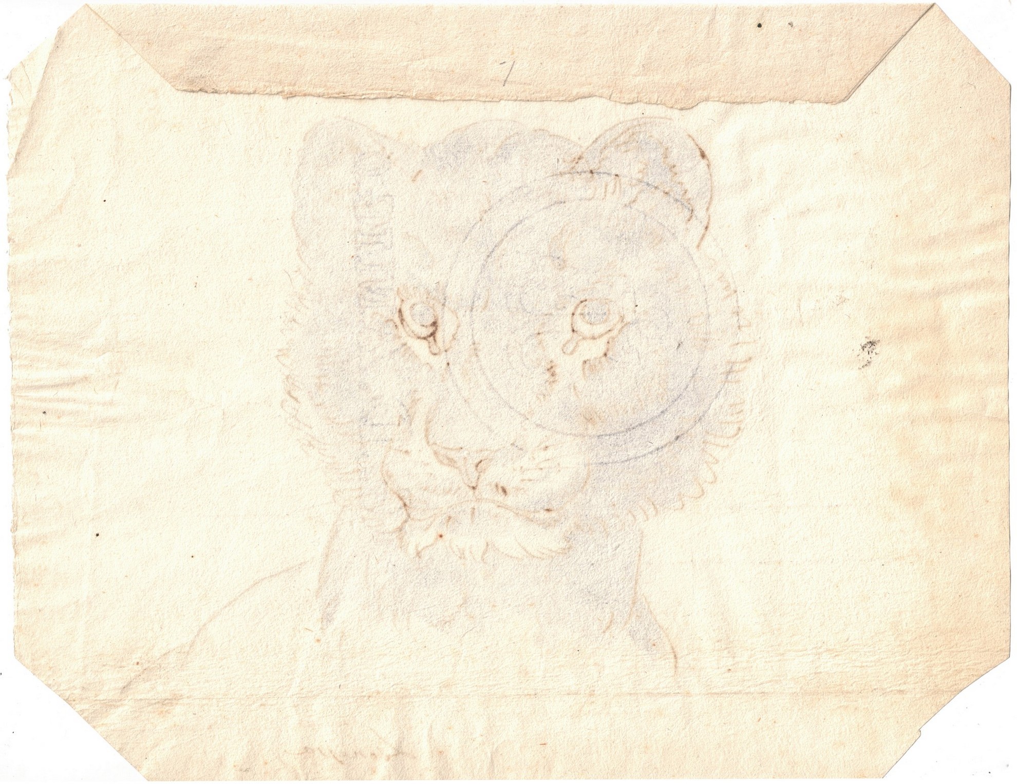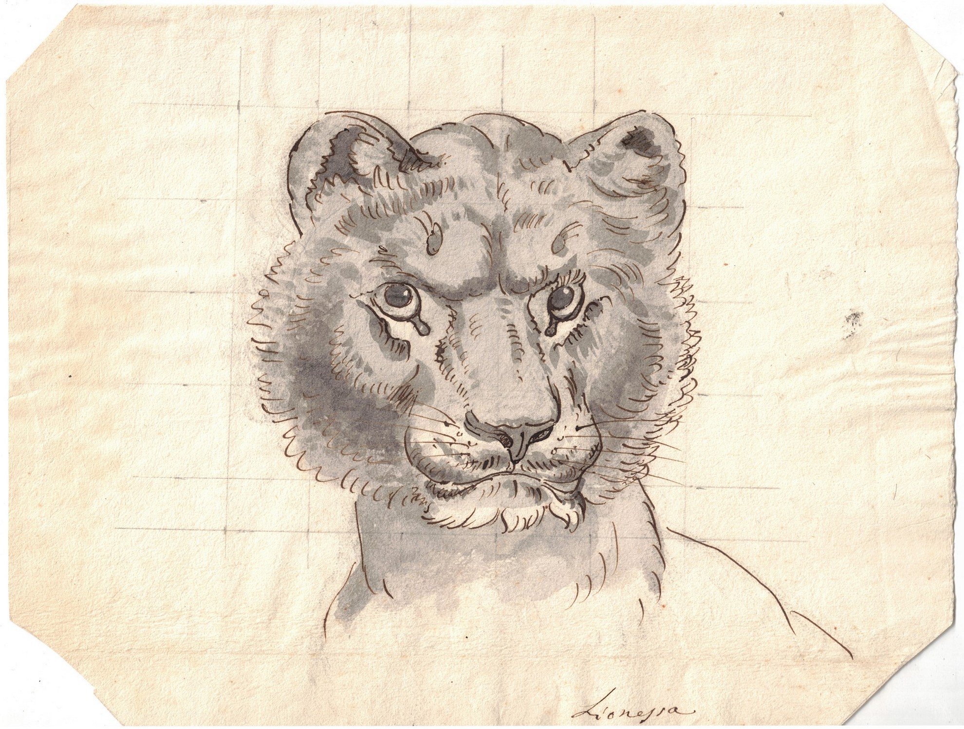 24x26,5 cm Fine XIX secolo Testa di leonessa Disegno a china e inchiostro bruno