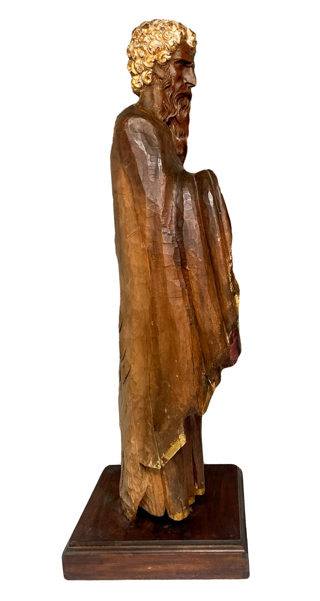 H cm 121, con base H cm 130 , base cm 42x42. XVI secolo Statua raffigurante Mosè In legno massello e oro. Presenti mancanze.