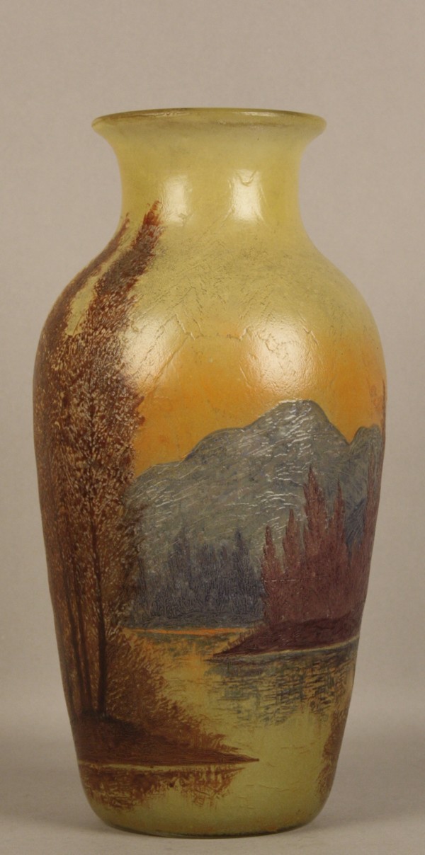 Firmato. Vaso a balaustro in vetro doppio, dipinto a smalti policromi su fondo verde acqua e arancio, con decoro raff. ''PAESAGGIO LACUSTRE, ALBERI E MONTI''. Firma a smalto LEGRAS. Epoca 1885. Con autentica di Franco Borga. Mis. Alt. cm. 27,3 ca.