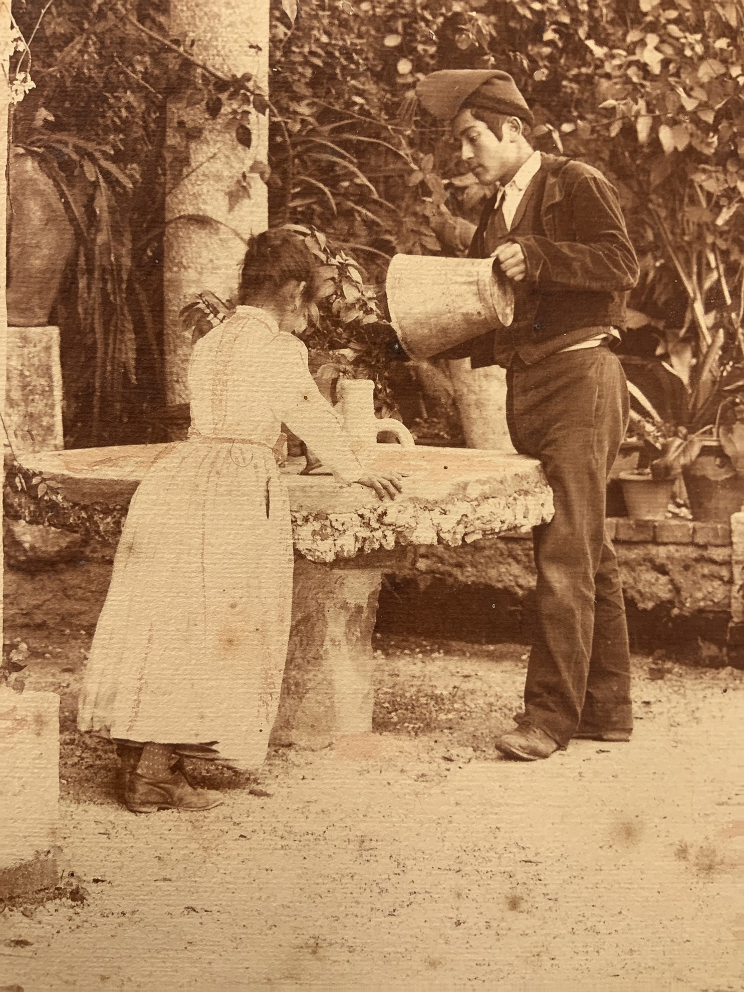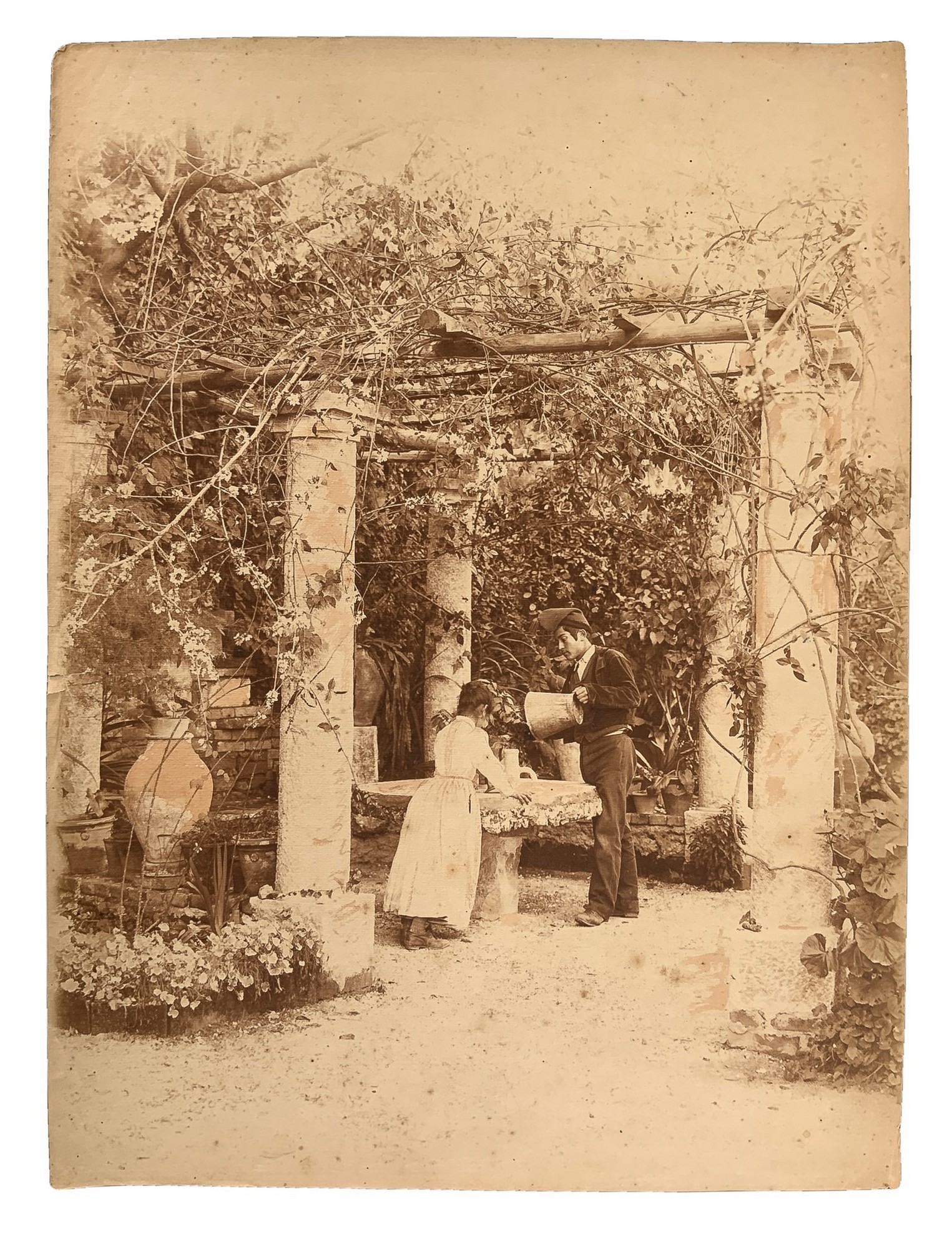 Bambina e uomo in un pergolato Stampa fotografica vintage su carta salata Numerata “192” e timbrata sul retro.