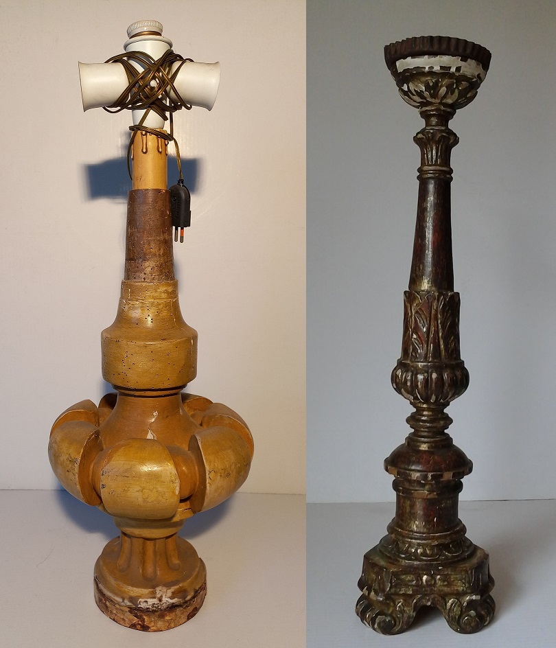 DUE ANTICHE TORCIERE IN LEGNO DI CUI UNA LACCATA H.CM.65 ED UNA ARGENTATA H.CM.62