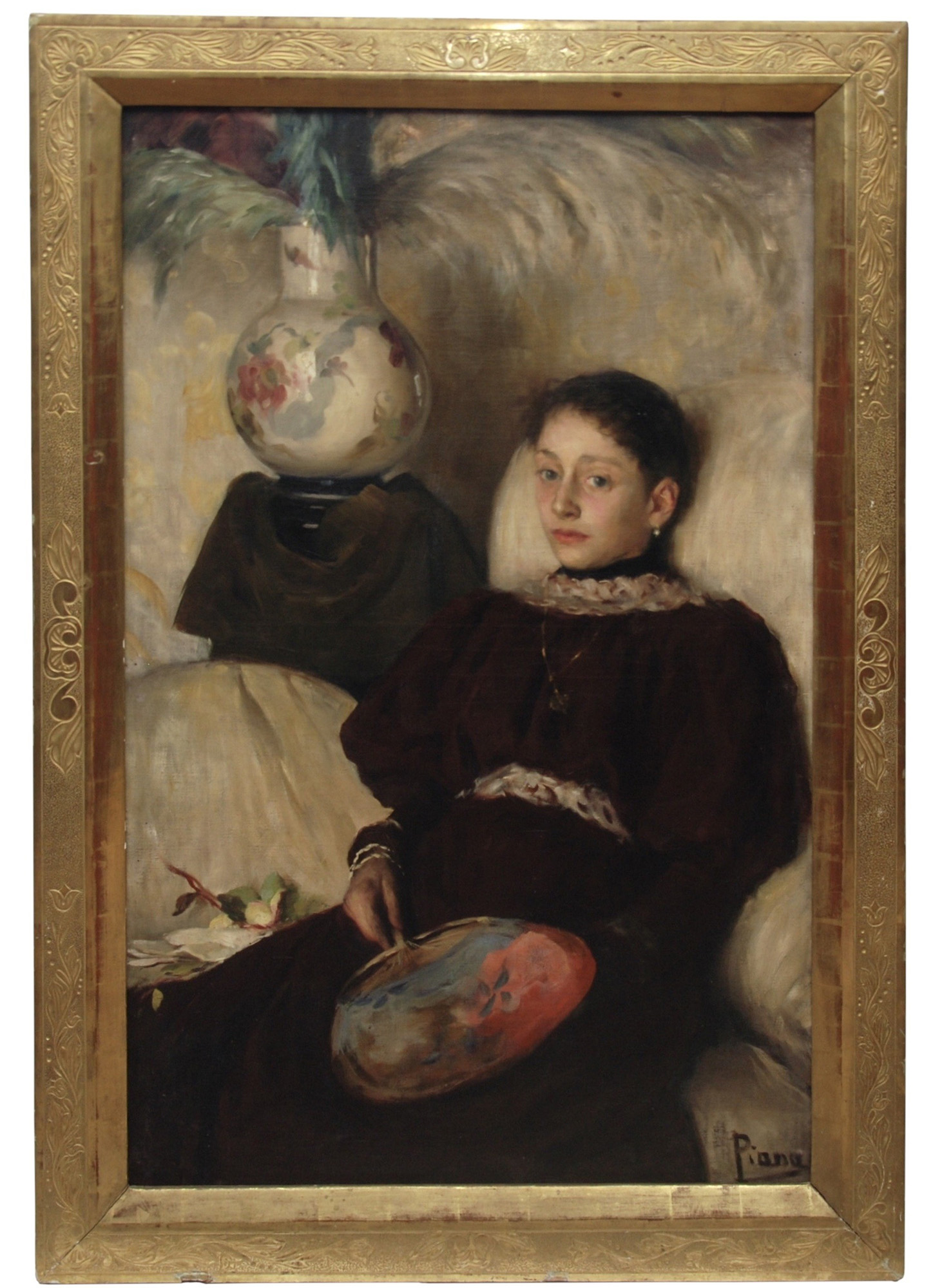 Giuseppe Ferdinando Piana (Ceriana 1864 - Bordighera 1956) olio su tela raff. "Giovane donna con vaso di fiori", firmato in basso a destra: Piana