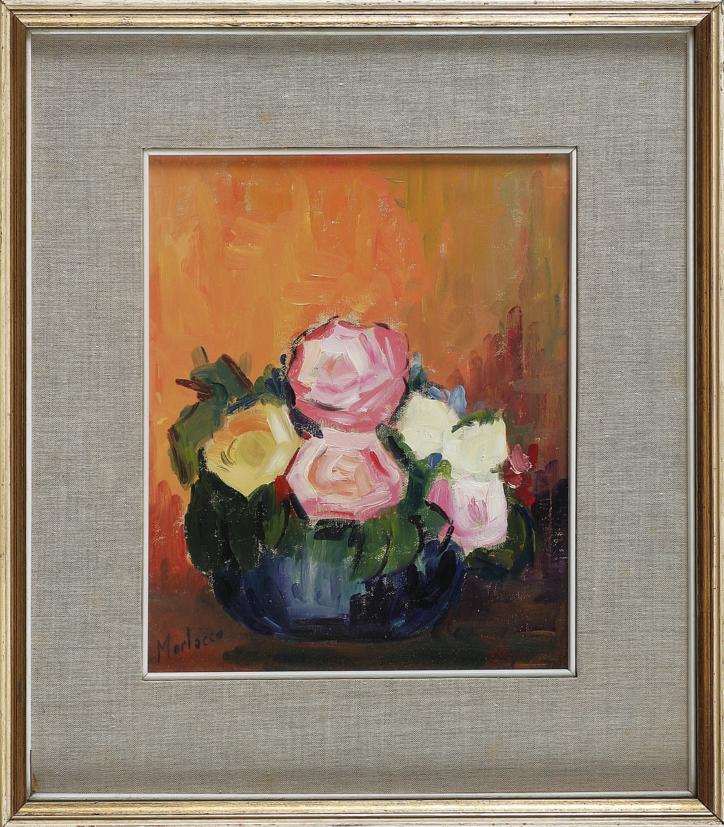 ANONIMO Vaso di fiori. Olio su cartone pressato. Cm 28,00 x 32,00. Firma in basso a sinistra. Cornice presente