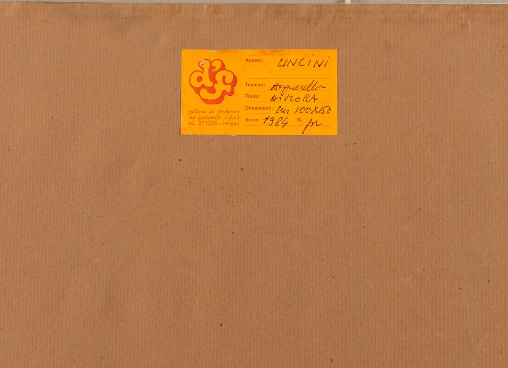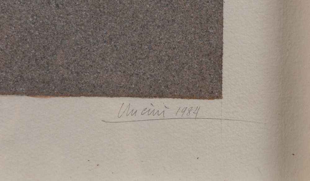 GIUSEPPE UNCINI (Fabriano 1929 - Trevi 2008) "Dimora", 1984. Tenica mista su carta grossa. Cm 150x100. Opera firmata e datata in basso a destra. Al retro reca etichetta della Galleria d'Arte De Foscherari, Bologna. Opera acquistata direttamente dall'artista, presso la Galleria d'arte De Foscherari, Bologna. Opera accompagnata da autentica su fotografia con timbro della Galleria d'Arte De Foscherari, Bologna. Esposizioni: L'acquerello gigante, aprile 1986, presso la Galleria d'Arte De Foscherari, Bologna.