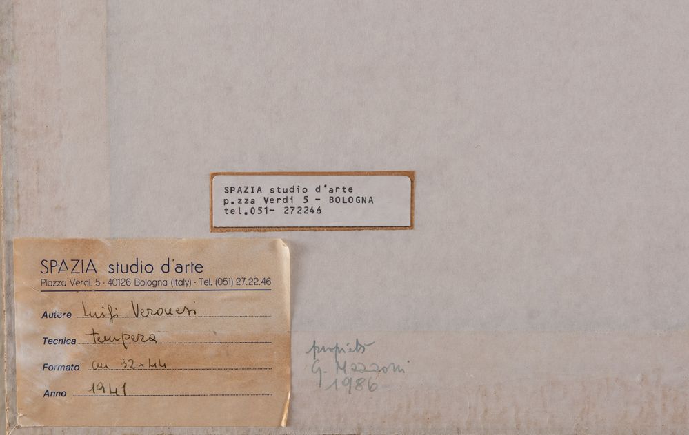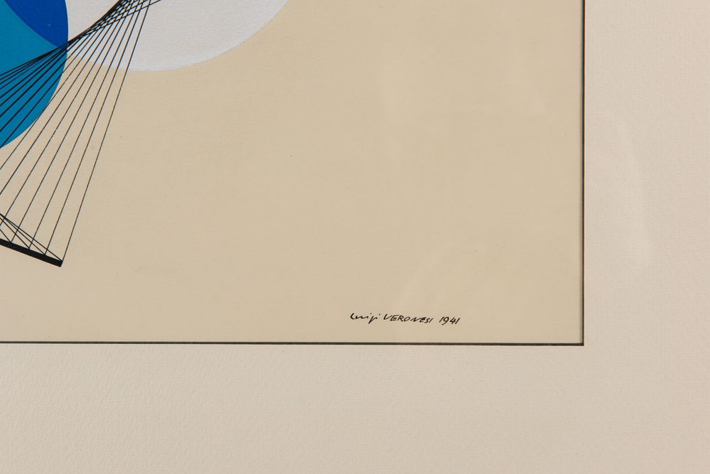LUIGI VERONESI (Milano 1908 - 1998) "Composizione con cerchi blu", 1941. Tempera su carta. Cm 32x42,5. Opera firmata e datata in basso a destra Luigi Veronesi 1941. Al retro reca etichetta della galleria d'arte Spazia, Bologna. Al retro della carta opera intitolata Composizione con cerchi blu.