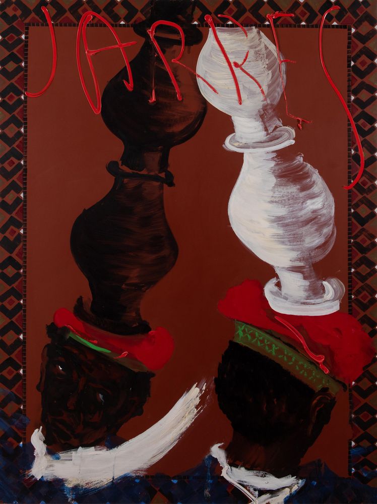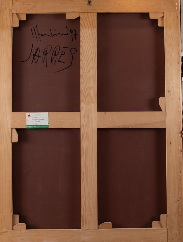 ALDO MONDINO (Torino 1938 - 2005) "Jarres", 1997. Olio su linoleum. Cm 120x90. Al retro opera firmata, datata e intitolata Mondino '97 Jarres. Al retro reca etichetta della Galleria d'Arte Gianpaolo Becherini Arte Contemporanea, Firenze. Opera accompagnata da autentica su fotografia dell'Archivio Mondino, con numero d'archiviazione 20120522172134. Bibliografia: catalogo generale.