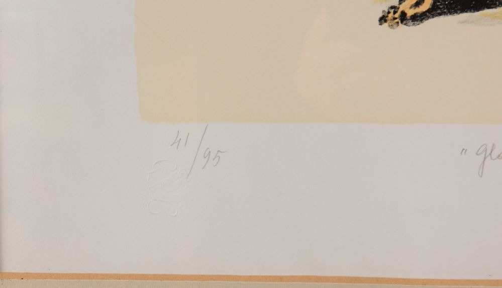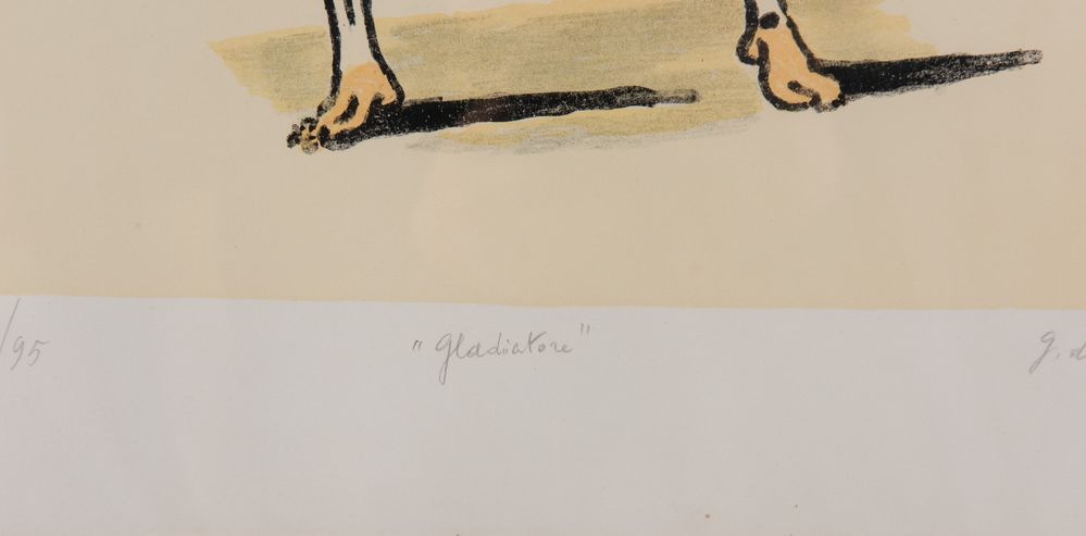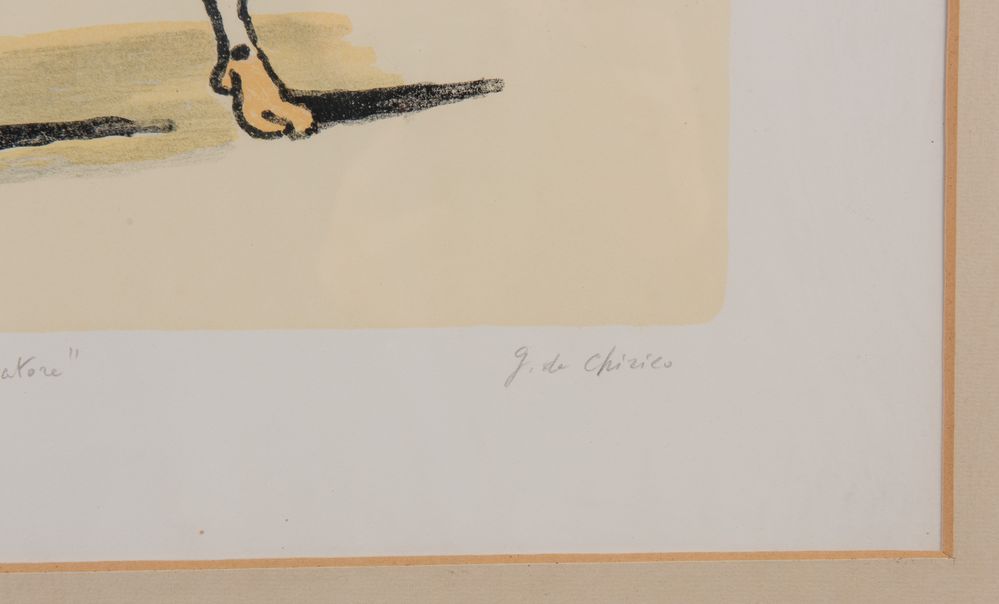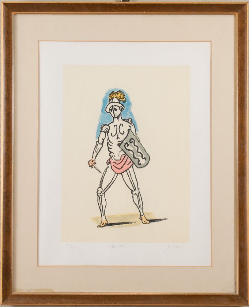 GIORGIO DE CHIRICO (Volo 1888 – Roma 1978). “Gladiatore”, 1972. Litografia a colori su carta. Cm 65x50. Opera firmata in basso a destra G. De Chirico, opera intitolata al centro “Gladiatore”, numeri di tiratura in basso a sinistra 41/95. Reca timbro a secco in basso a sinistra. Opera pubblicata in “Catalogo generale della Grafica di Giorgio De Chirico” edizioni Bora tavola n 154, p. 178; e in “Catalogo Nazionale Bolaffi”, n. 8, Torino 1978. Mostre: Kamakura/Tokyo/Kyoto/Nagoya, 1973-1974.
