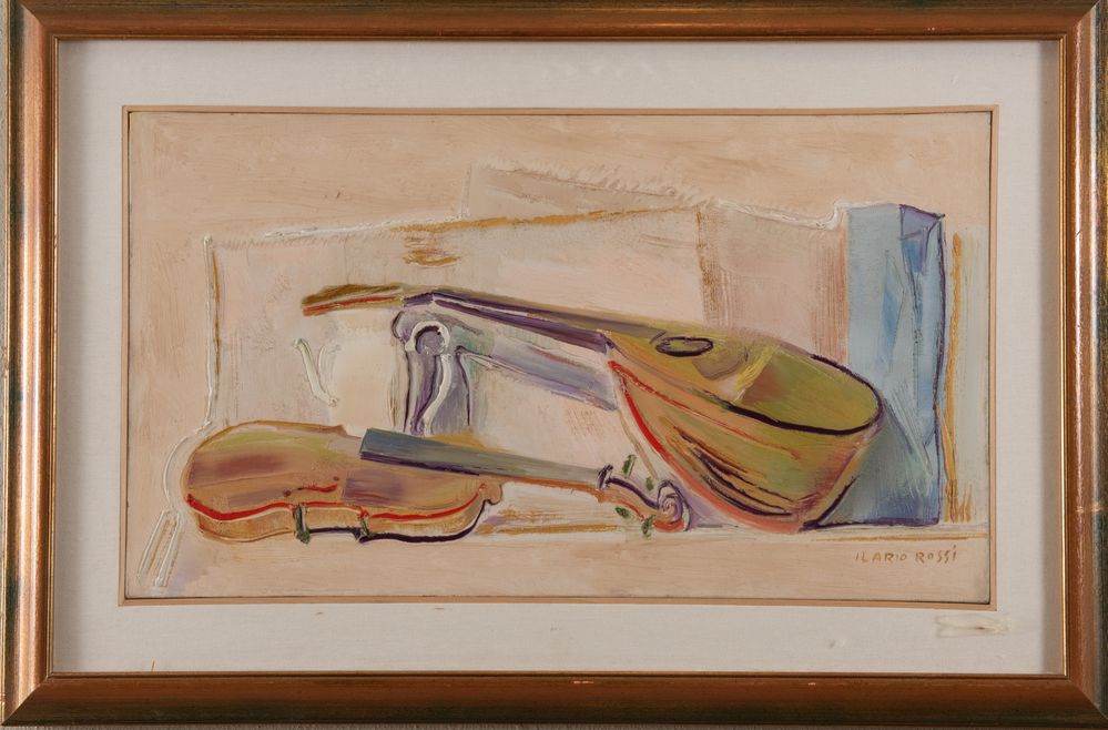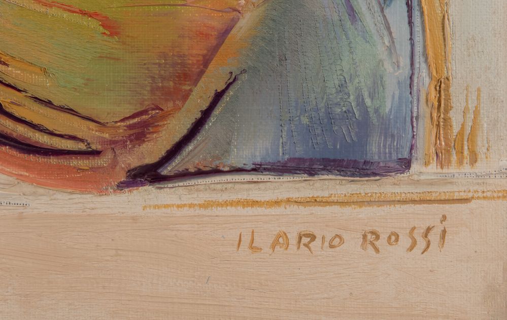 ILARIO ROSSI (Bologna 1911 - Bologna 1994) "Natura morta", 1976. Olio su tela. Cm 39,5x69,5. Opera firmata in basso a destra Ilario Rossi. Al retro reca scritta Olio autentico 76. Opera accompagnata da autentica su fotografia. Opera accompagnata da autentica a firma del figlio Antonio Rossi. Opera accompagnata da autentica a firma del maestro. Opera pubblicata nel catalogo generale del maestro.