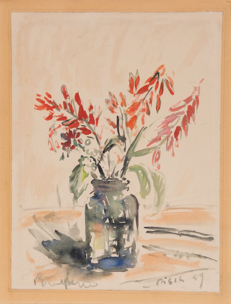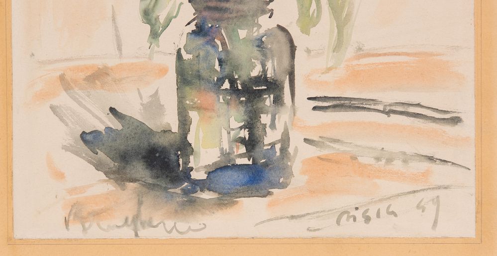 FILIPPO DE PISIS (Ferrara 1896 - Milano 1956) "Natura morta", 1949. Acquerello su carta applicato su cartone. Cm 41,5 x 31. Opera firmata e datata in basso a destra Pisis 49. Opera accompagnata da autentica su fotografia dell'Archivio Filippo De Pisis, Milano.