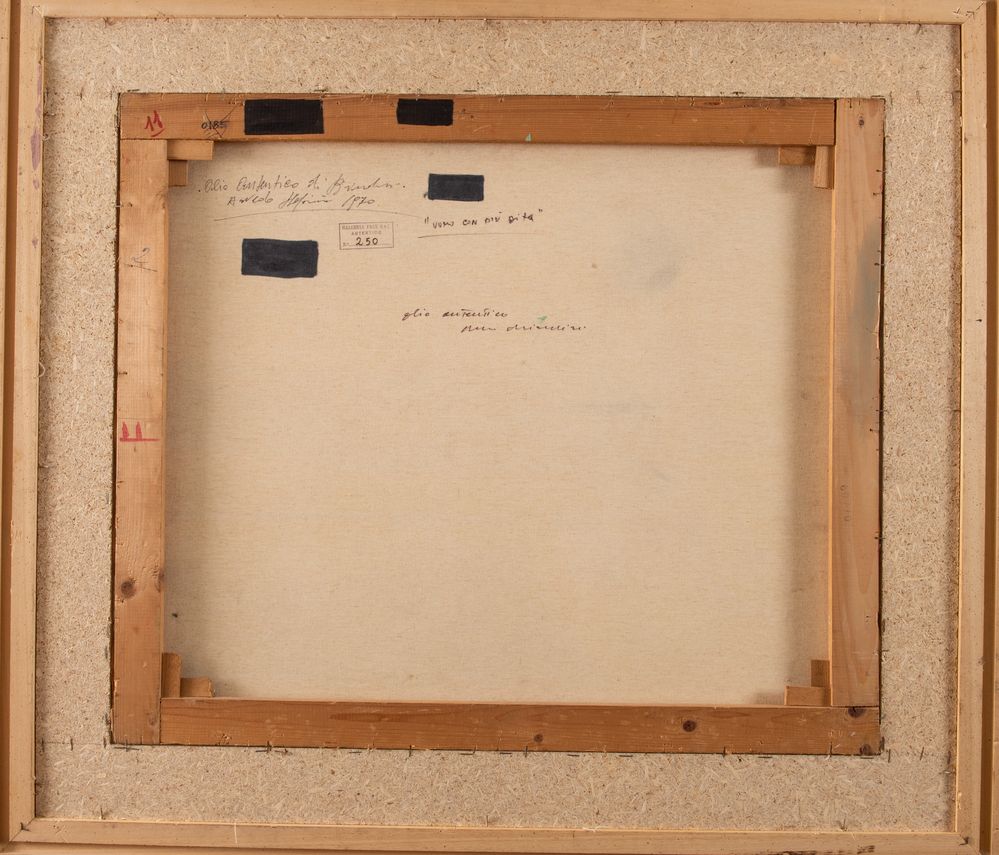 REMO BRINDISI (Roma 1918 - Lido di Spina 1996) "Uomo con più dita", anni '70. Olio su tela. Cm 60x70. Al retro opera intitolata Uomo con più dita. Al retro reca scritta per autentica "olio autentico Remo Brindisi". Al retro reca timbro della Galleria Pace Milano, con numero 250. Opera accompagnata da autentica su fotografia.