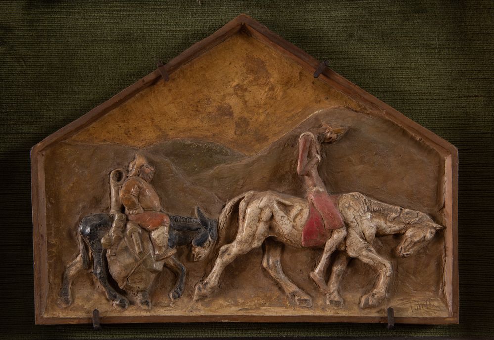 CLETO TOMBA (Castel San Pietro Terme 1898 - Bologna 1987) "Don Chisciotte e Sancho Panza, il ritorno", 1933. Formella in terracotta policroma. Cm 18,5x27. Opera firmata in basso a destra Tomba 933.