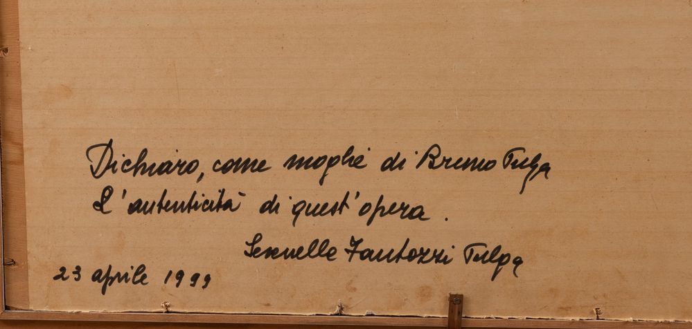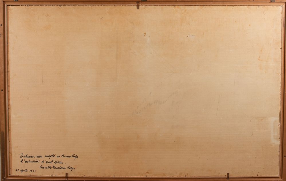 BRUNO PULGA (Bologna 1922 - 1992) "Senza titolo". Olio su carta applicato su tavola. Cm 93x150. Al retro reca dichiarazione di autenticità a cura della moglie in data 23 aprile 1999.