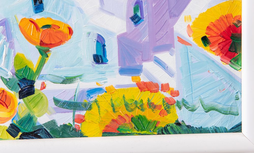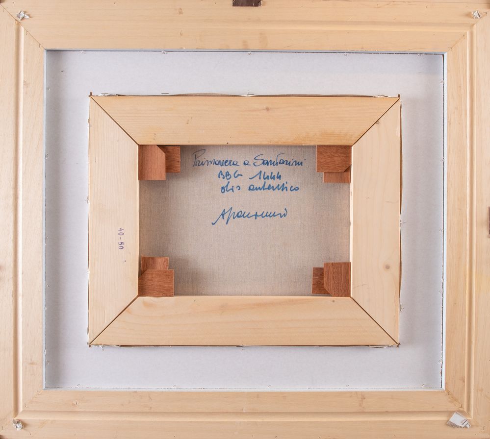 ATHOS FACCINCANI (Peschiera del Garda 1951) "Primavera a Santorini", 2012. Olio su tela. Cm 40x50. Opera firmata in basso a destra Faccincani. Al retro opera firmata e intitolata A. Faccincani Primavera a Santorini. Al retro scritta per autentica Olio autentico. Opera accompagnata da autentica su fotografia del maestro.