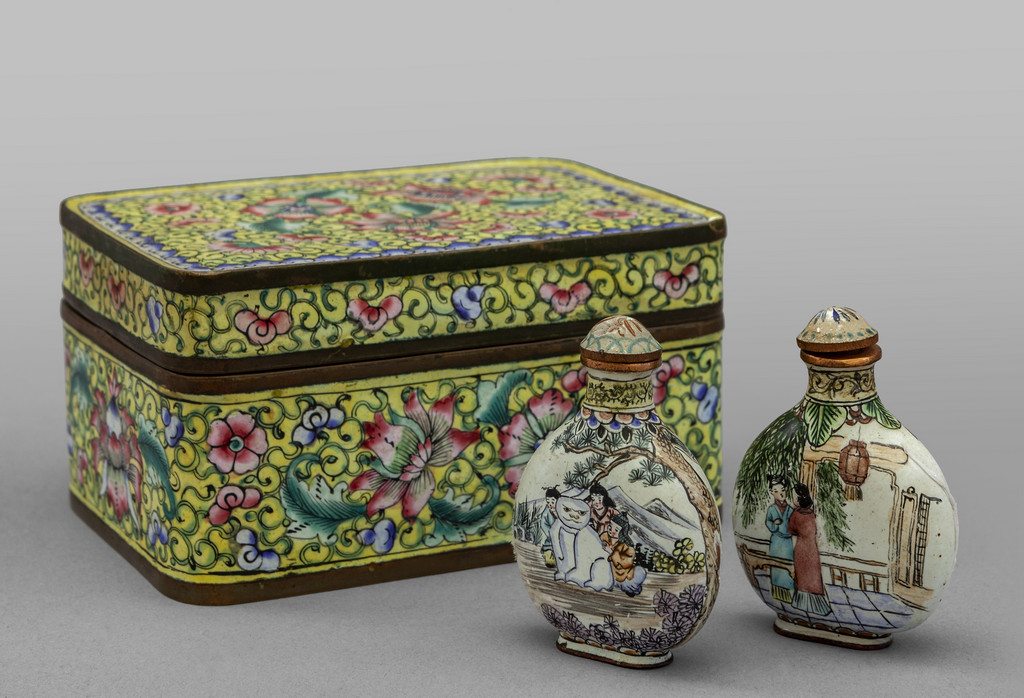 Scatola cinese smaltata inizi sec.XX (10x8xh.5 5) e due snuff bottle in smalto