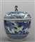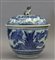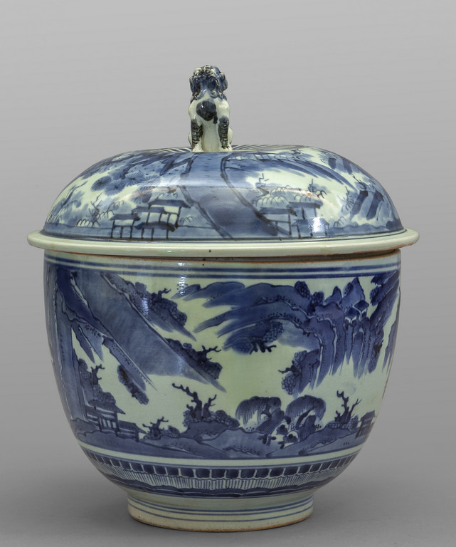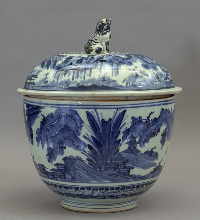 Cachepot con coperchio in porcellana decorato in bianco e blu a paesaggio Cina sec.XIX