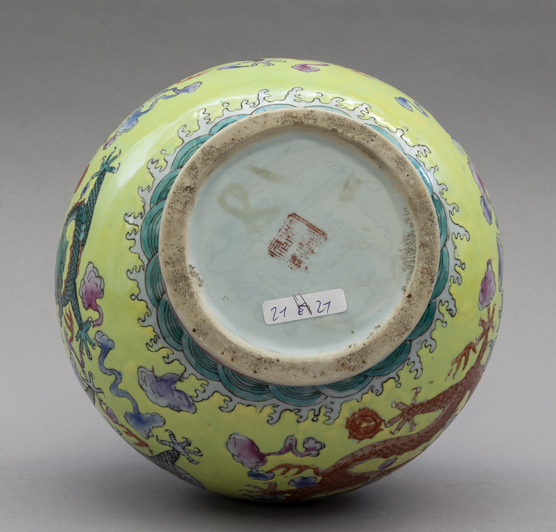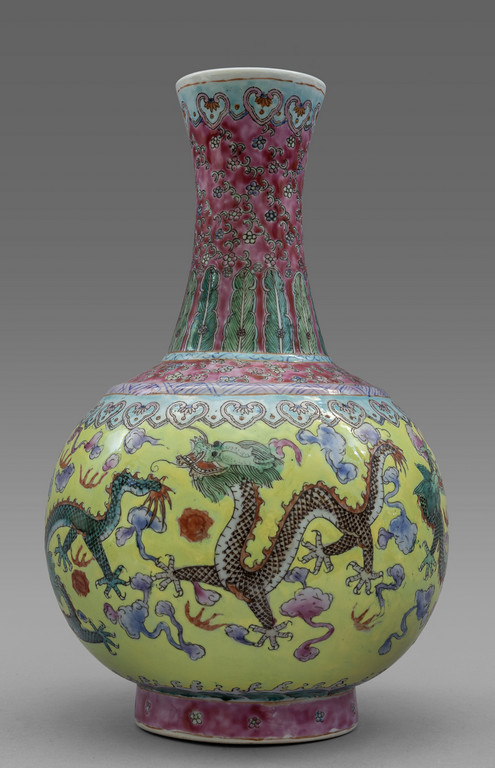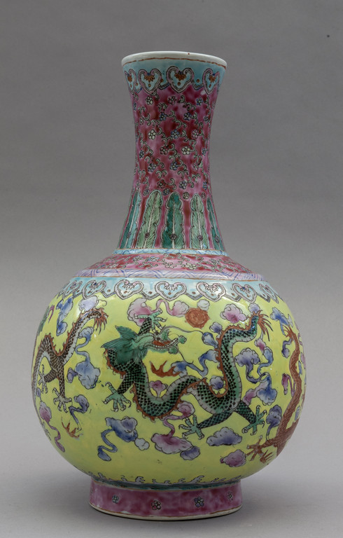 Vaso a collo lungo in procellana Famiglia rosa decorato con dragoni e nuvole marcato alla base Cina sec.XX