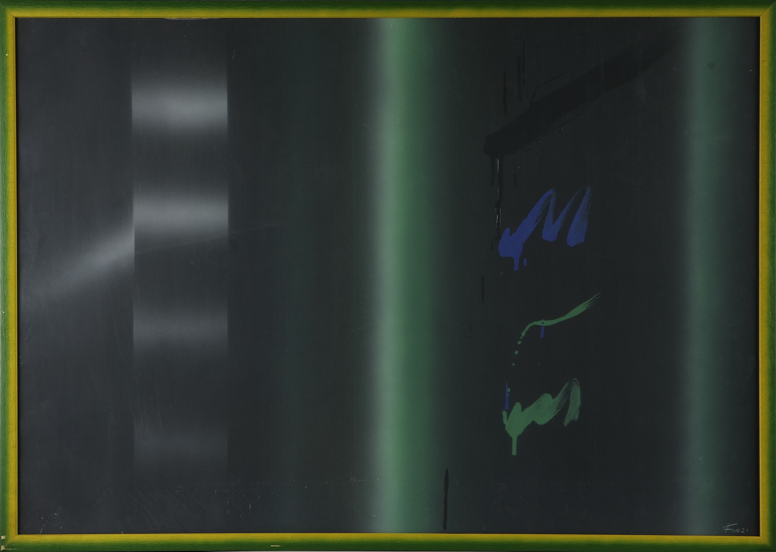 FINZI ENNIO (n. 1931) Senza titolo. Acrilico su cartoncino. Cm 100,00 x 70,00. Firma in basso a destra. Autenica dell'artista su fotografia. Cornice presente