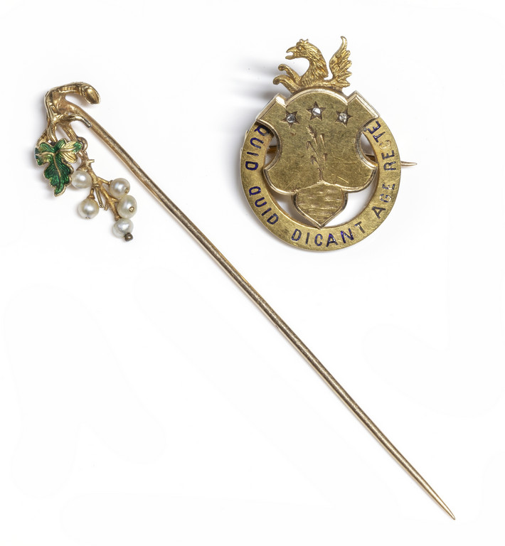 Lotto composto da spilla a scudo araldico in oro e spillino da giacca in oro smalti e perline