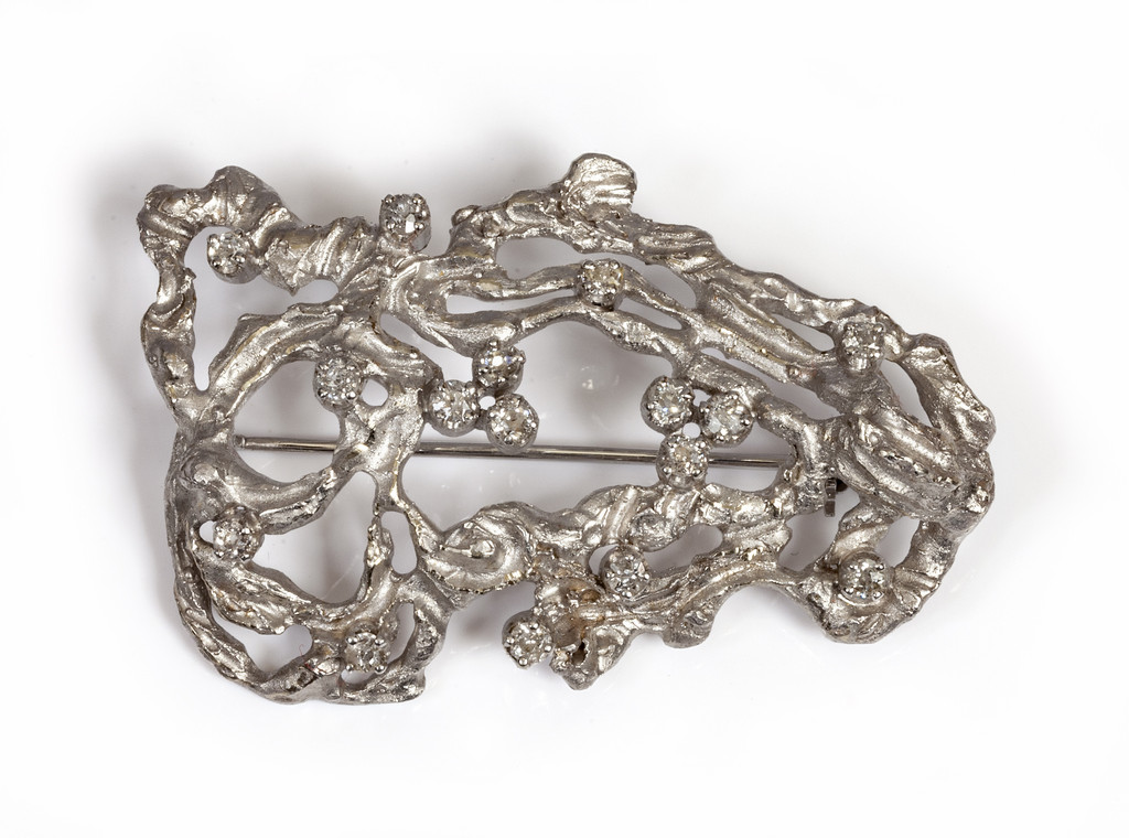 Spilla in oro bianco firmata Sforza con classica lavorazione lucido/satinata sulla quale sono incastonati sedici diamanti vecchio taglio per tot di ct 0 80 circa.
