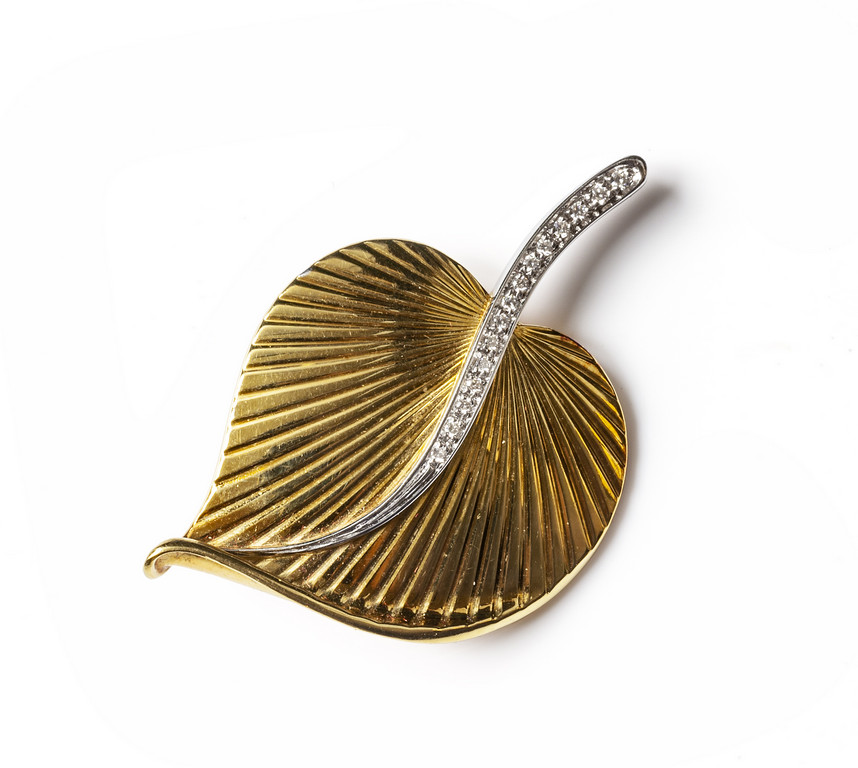 Spilla a guisa di foglia in oro giallo e bianco con piccoli diamanti.