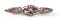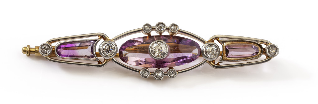 Spilla in oro bianco e giallo a forma di barra con montate tre ametiste taglio fantasia e diamanti naturali vecchio taglio per tot ct 0 40 circa