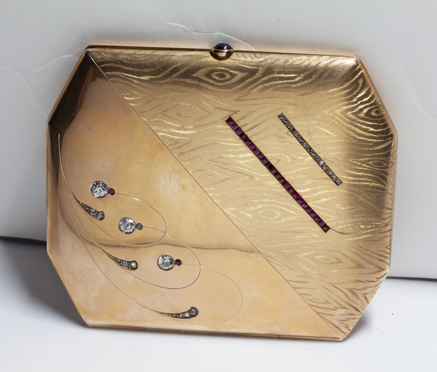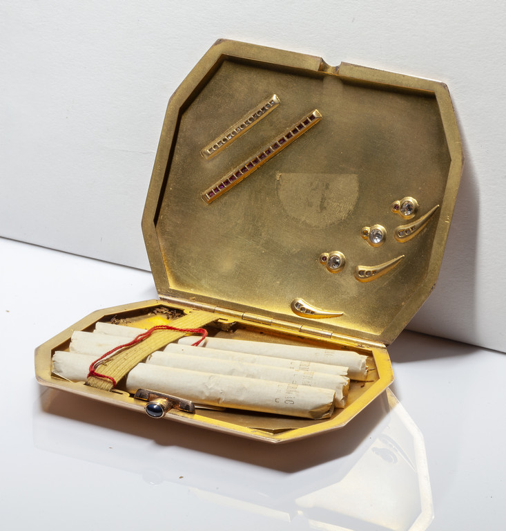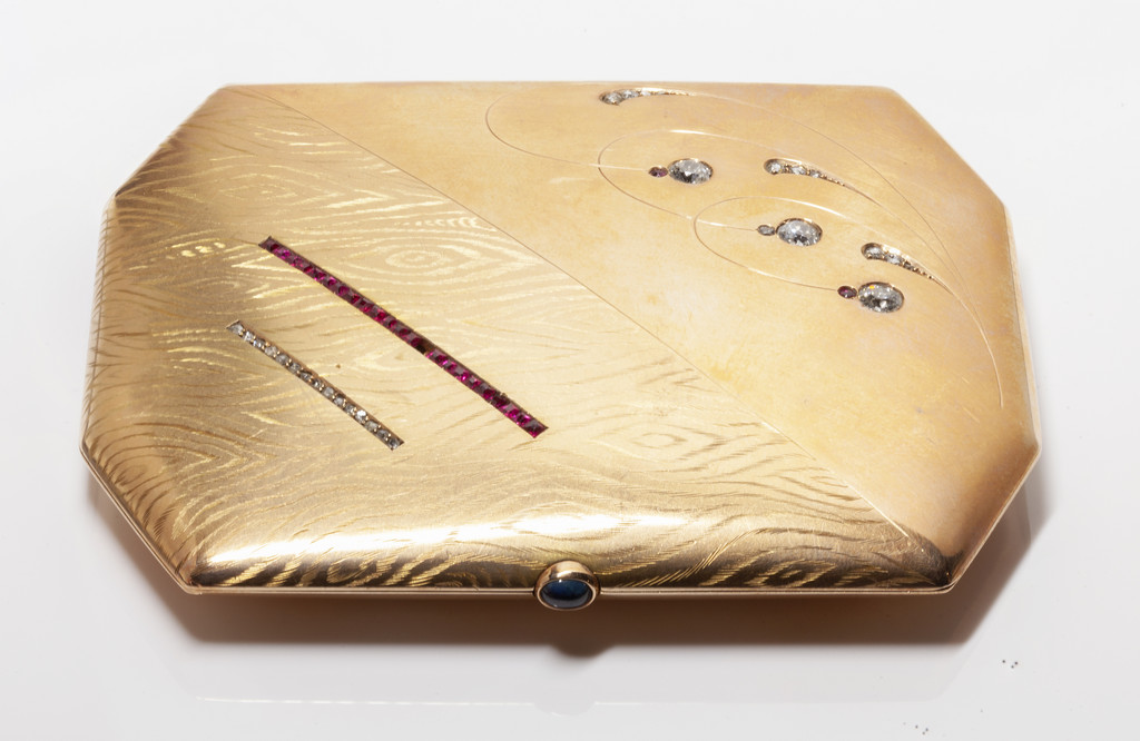 Scatola porta sigarette in oro rosso 14 kt con incassati diamanti e rubini finemente incisa.
