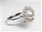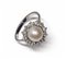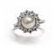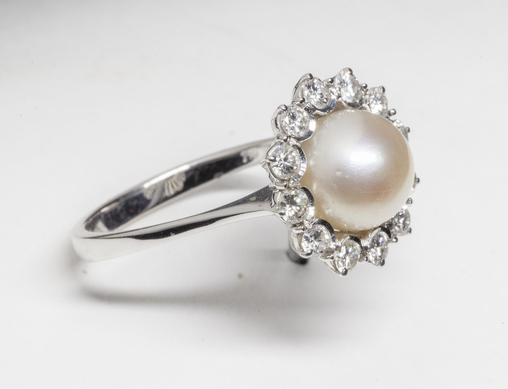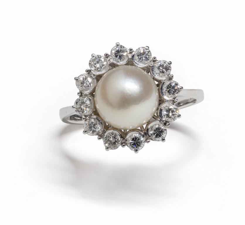 Anello in oro bianco con perla centrale coltivata di 9 mm di diametro e contorno di 12 diamanti rotondi taglio a brillante per circa 0 60 ct stimati.
