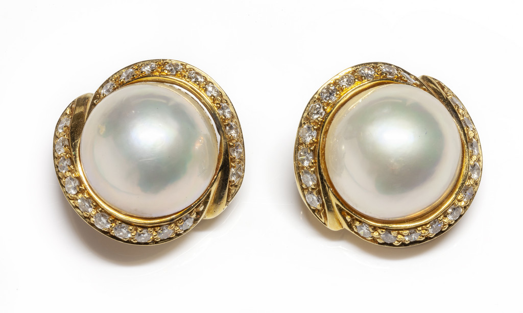 Orecchini in oro giallo con perle mabè e diamanti a contorno per circa 1 00 ct stimati.