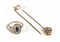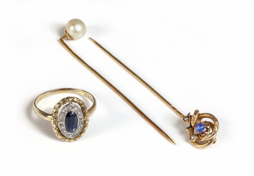 Lotto composto da due spille da cravatta in oro giallo una con perle coltivate una con microperle ed uno zaffiro di sintesi ed un anello in oro giallo con incastonato un vetro blu e piccole rosette di diamante