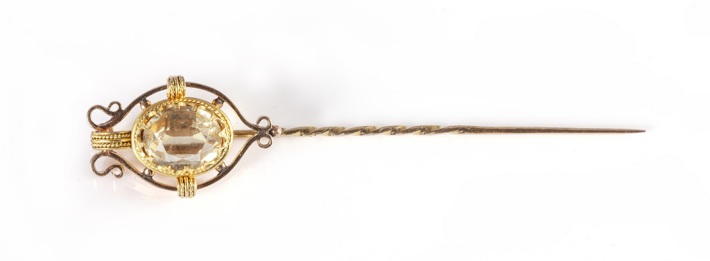 Spilla da cravatta in oro giallo con montato un quarzo citrino taglio ovale